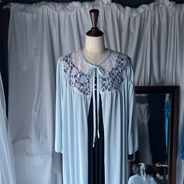きれいな水色と白いレースが美しいランジェリーガウン。 ランジェリー系のアイテムを個人的にもよくスタイリングに使うのですが、Tシャツやワンピースなど重ね着が楽しい一着です! 黒いお洋服に重ねると少し締まって、白や淡い色のお洋服に重ねるとやわらかくなる、中に着るお洋服によって、白いレースや水色の見え方が変わるのでまたそこも楽しい。 繊細な素材なので、引っかけにご注意ください。 また、丈が長いので、必要に応じて裾上げのお直しされるとよいかと思います。 (申し訳ないのですが、当店ではできません...) こちらの商品は古着です。 /ダメージについて 画像のような引っかけた跡がいくつかと、小さなシミ、小さな汚れがあります。 画像をご覧ください。 検品を行っておりますが、見落としてしまう程度のダメージがある場合もございます。 古着の特性としてご理解いただけますと幸いです。 /色味について できるだけ実物に近い色味になるよう撮影しておりますが、 撮影環境やご覧いただく端末により異なる場合がございます。 あらかじめご了承くださいませ。 ご不明点がございましたら、お気軽にお問い合わせくださいませ。 ※お届け方法に、こねこ便、レターパックプラス、ゆうパック60サイズもお選びいただけるようになっておりますが、こちらのお届け方法はとてもコンパクトに小さく小さくお畳みする形となります。ご了承ください。 素材 ナイロン 100% サイズ 着丈約138cm、肩幅約43cm、袖丈約49cm