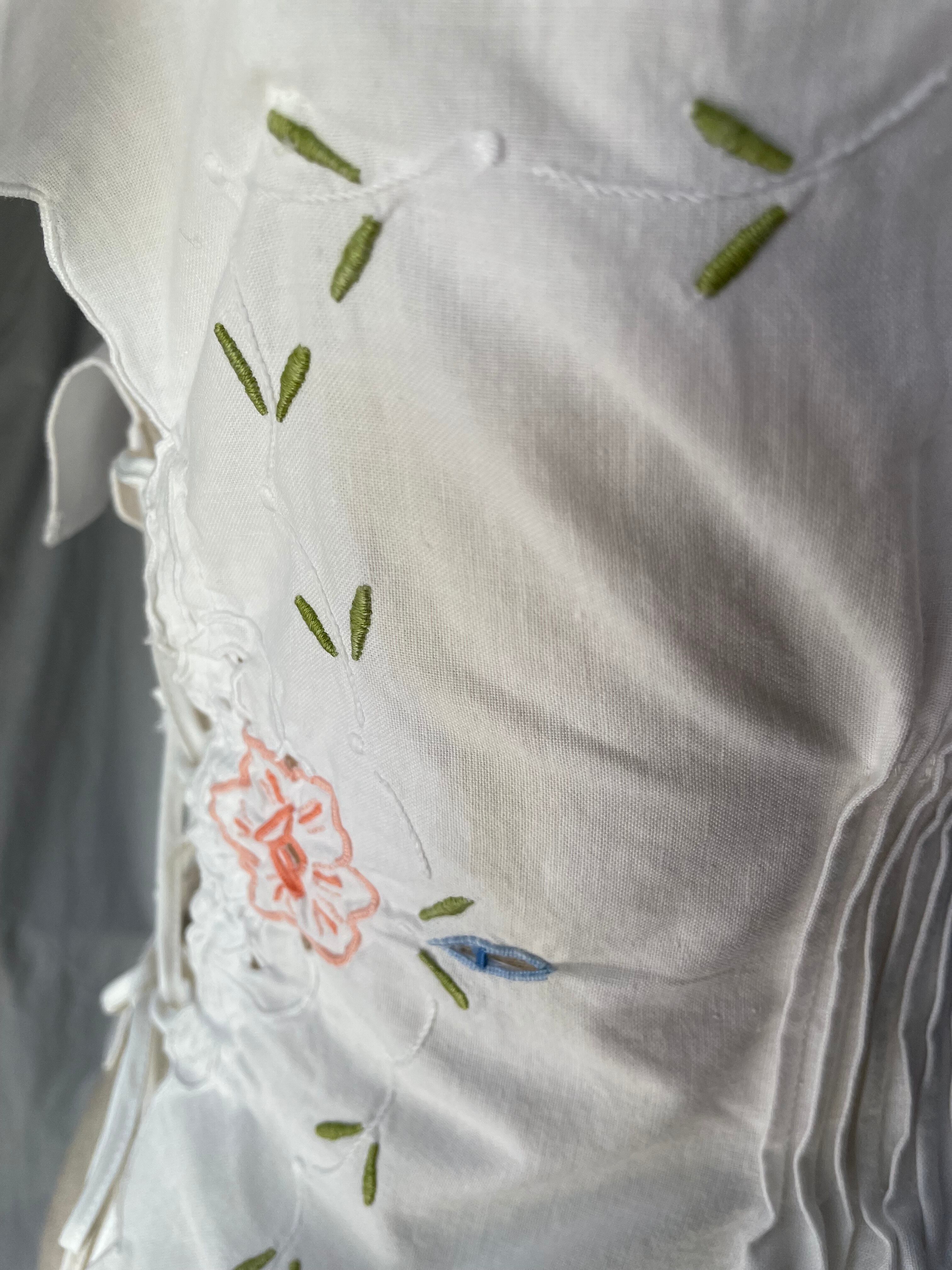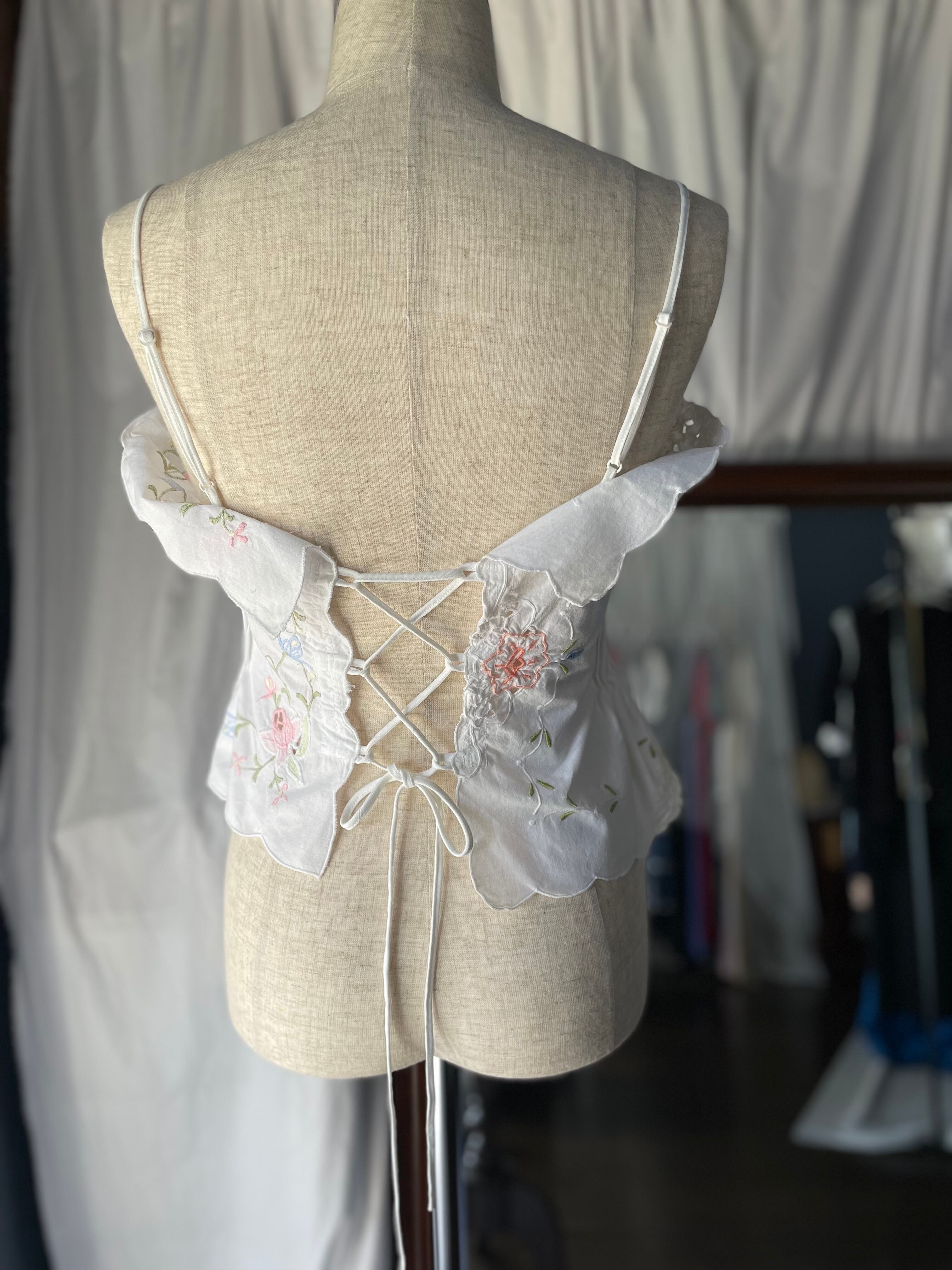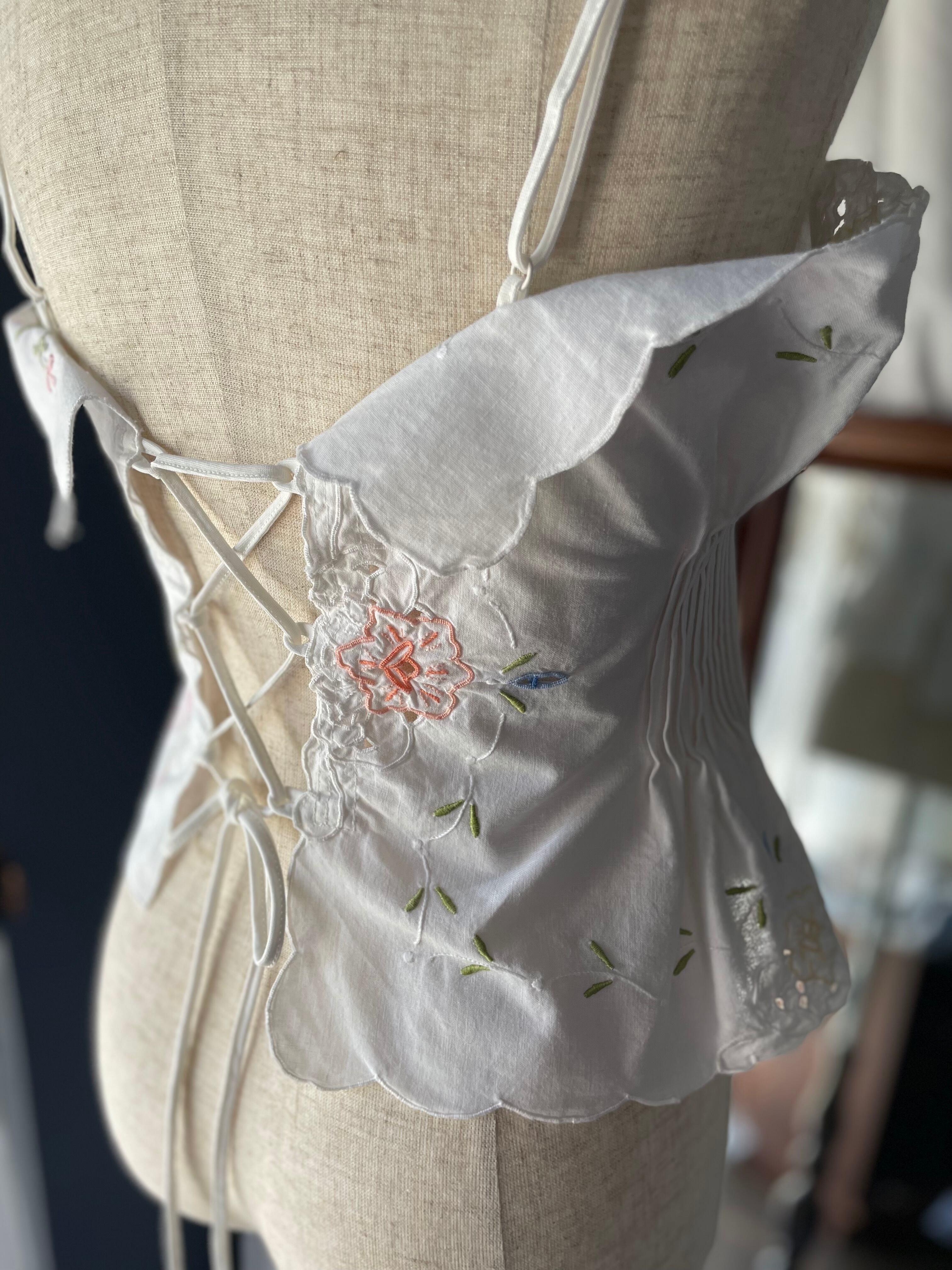 こちらの商品はvintageのハンカチをビスチェに仕立て直したもので、素材に古布を使用しています。