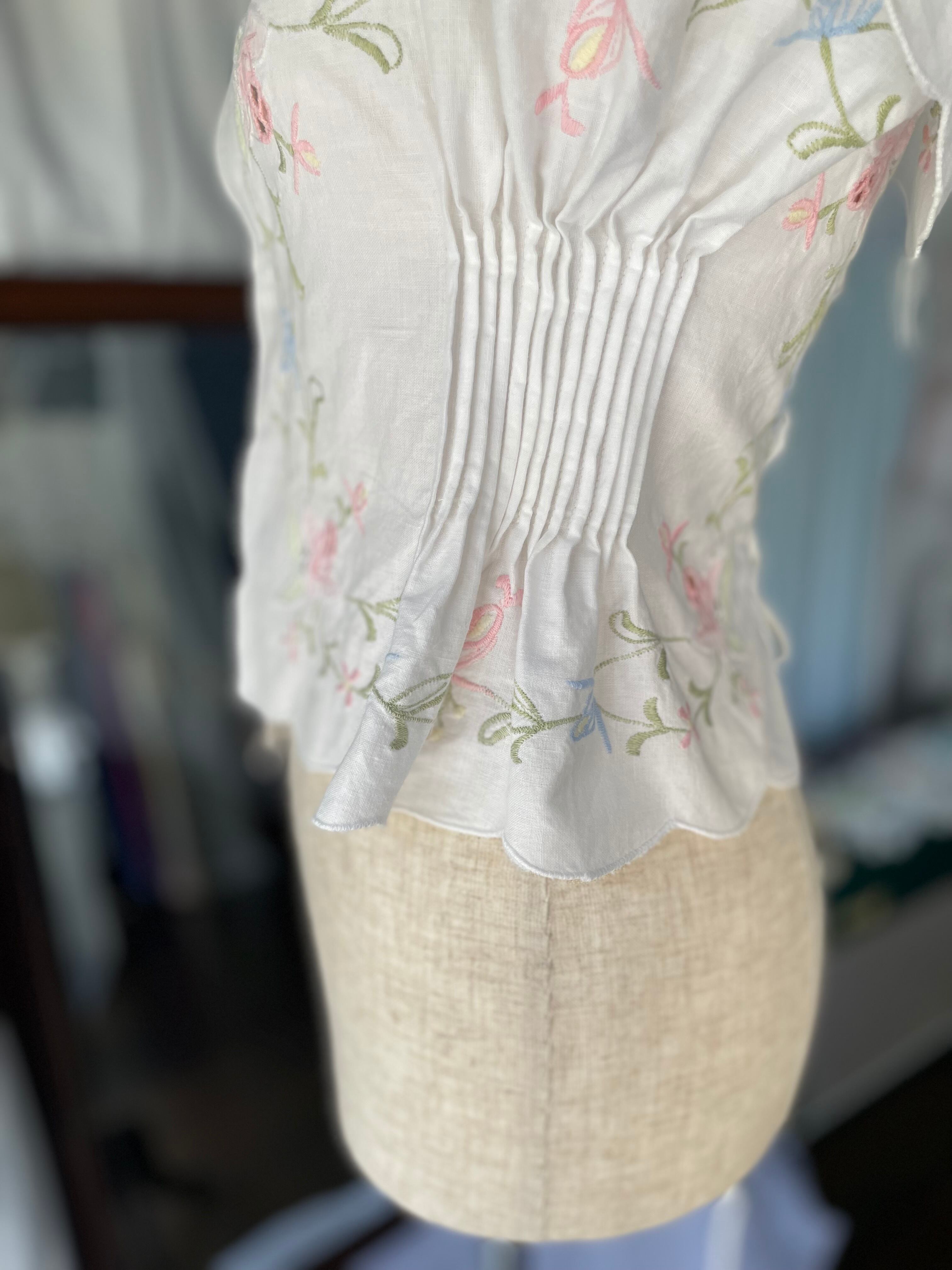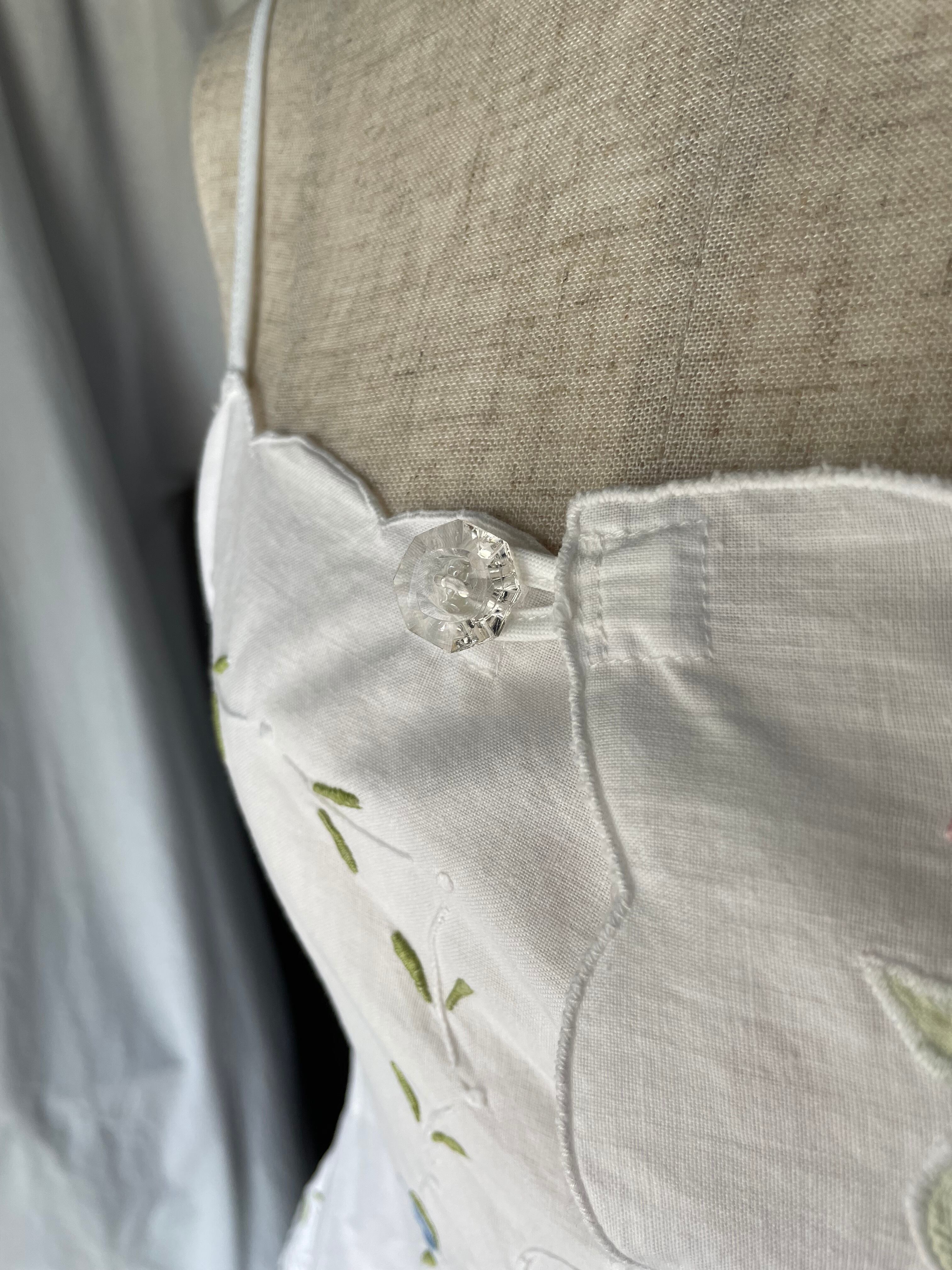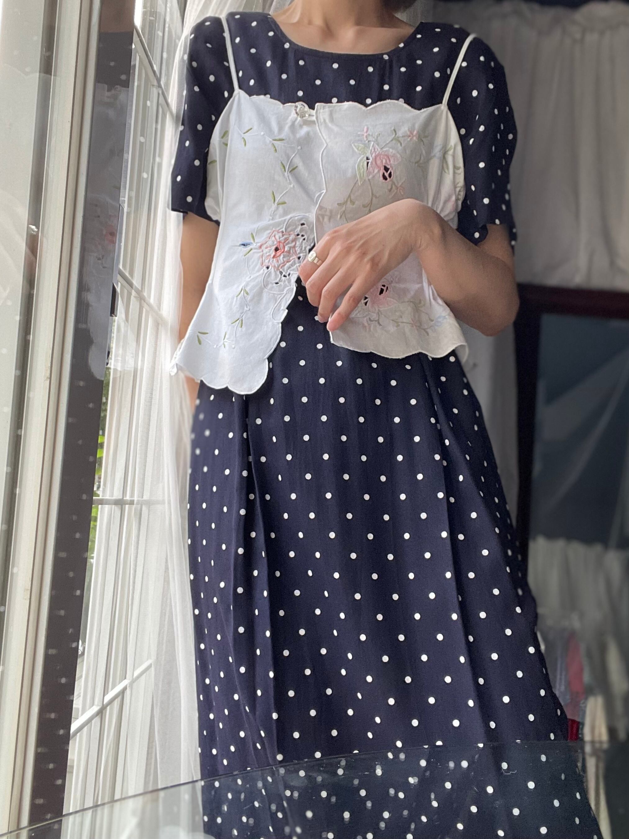 ハンカチーフならではの刺繍と縁取り、フロントのガラスボタンもかわいい。