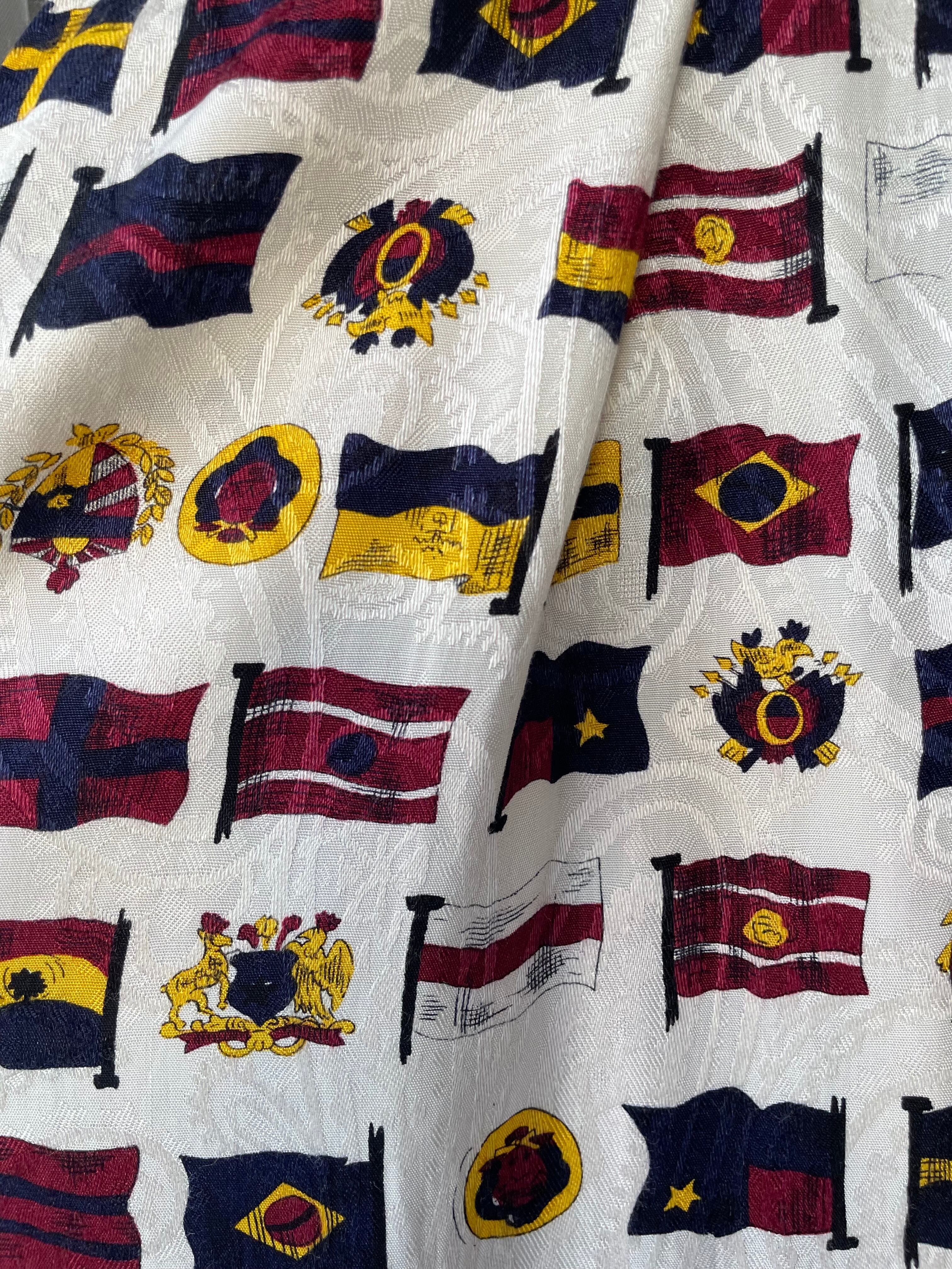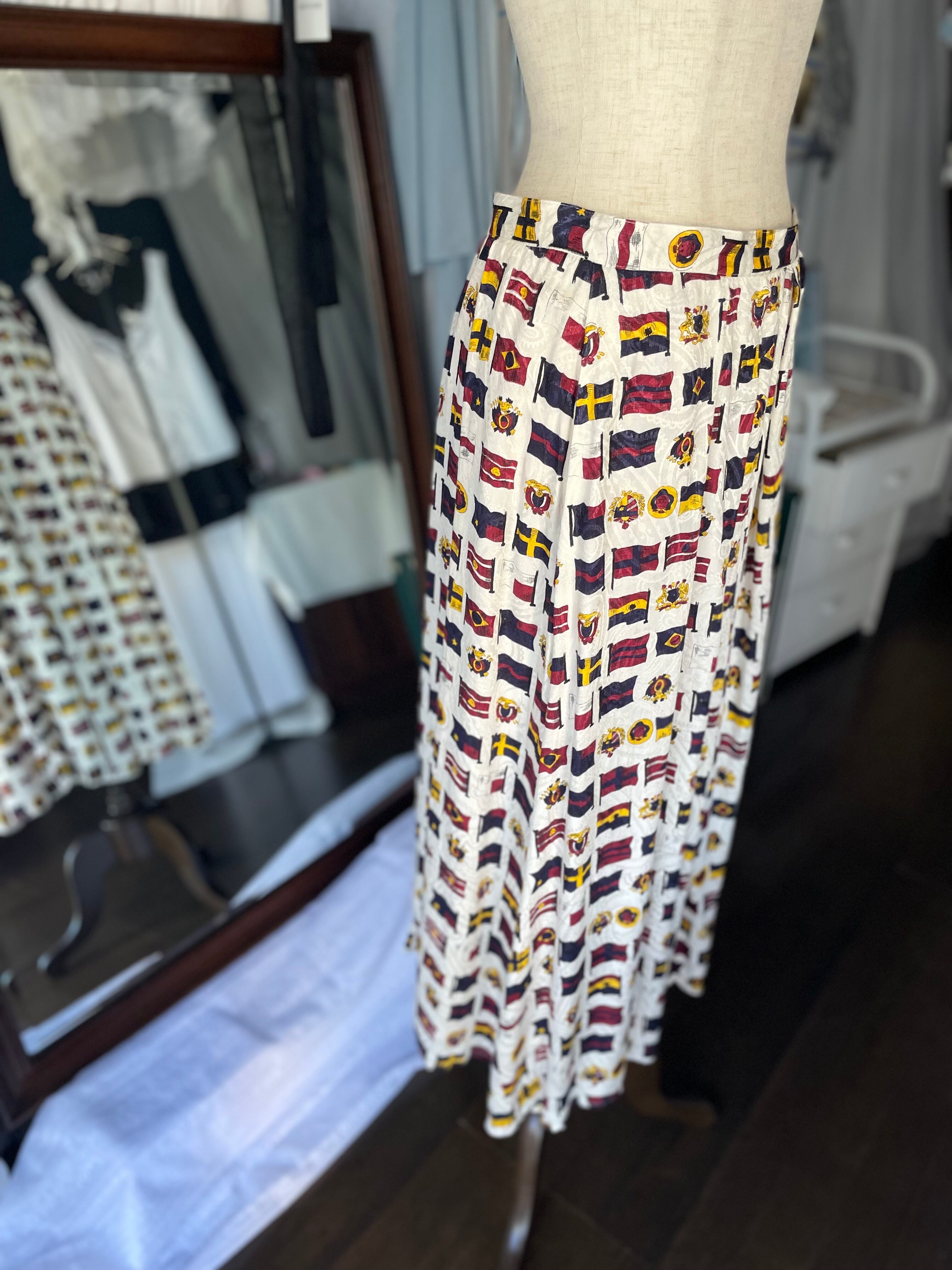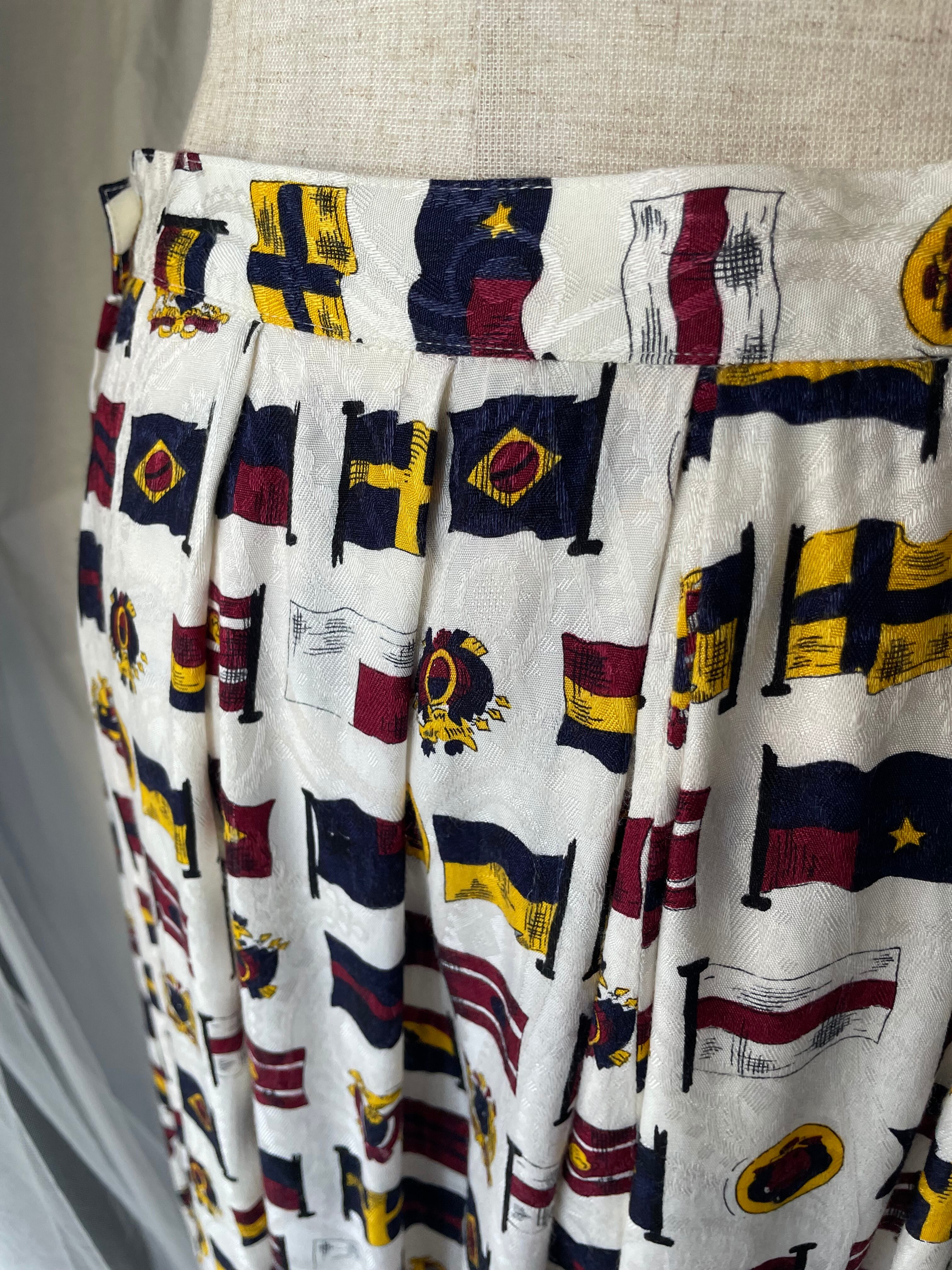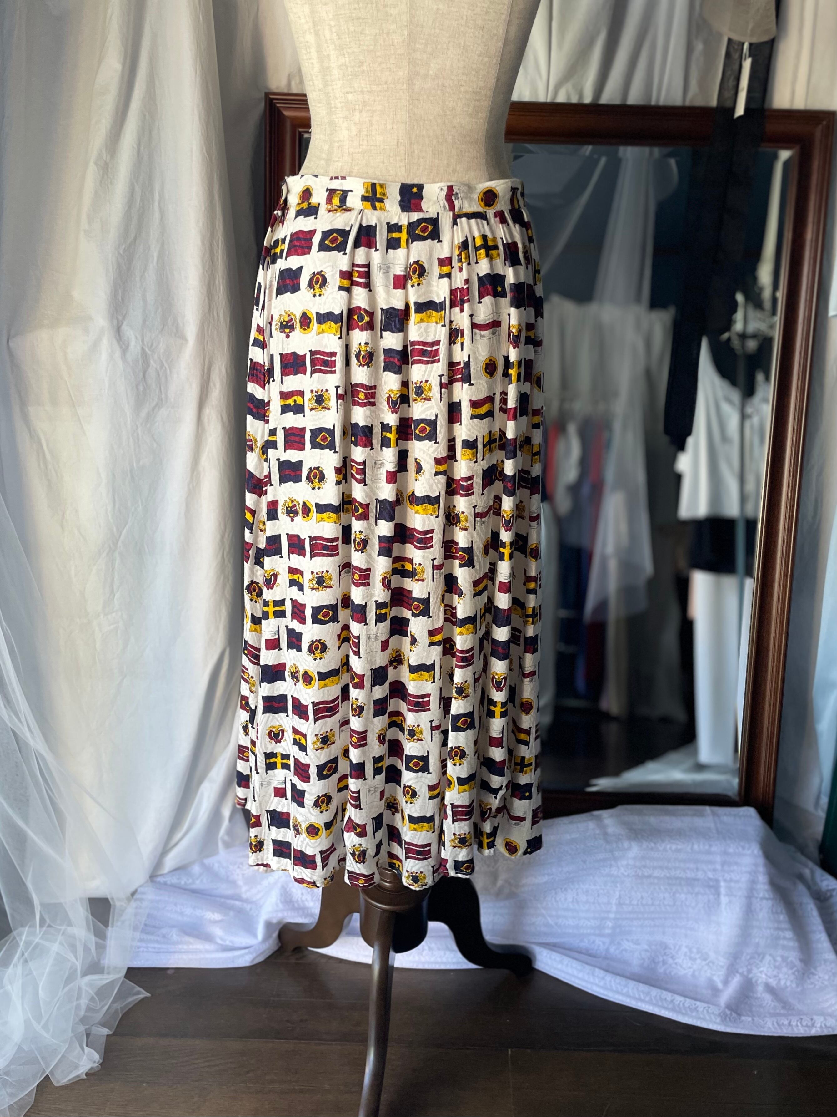 フラッグいっぱいの中にエンブレムも並ぶ総柄スカート。