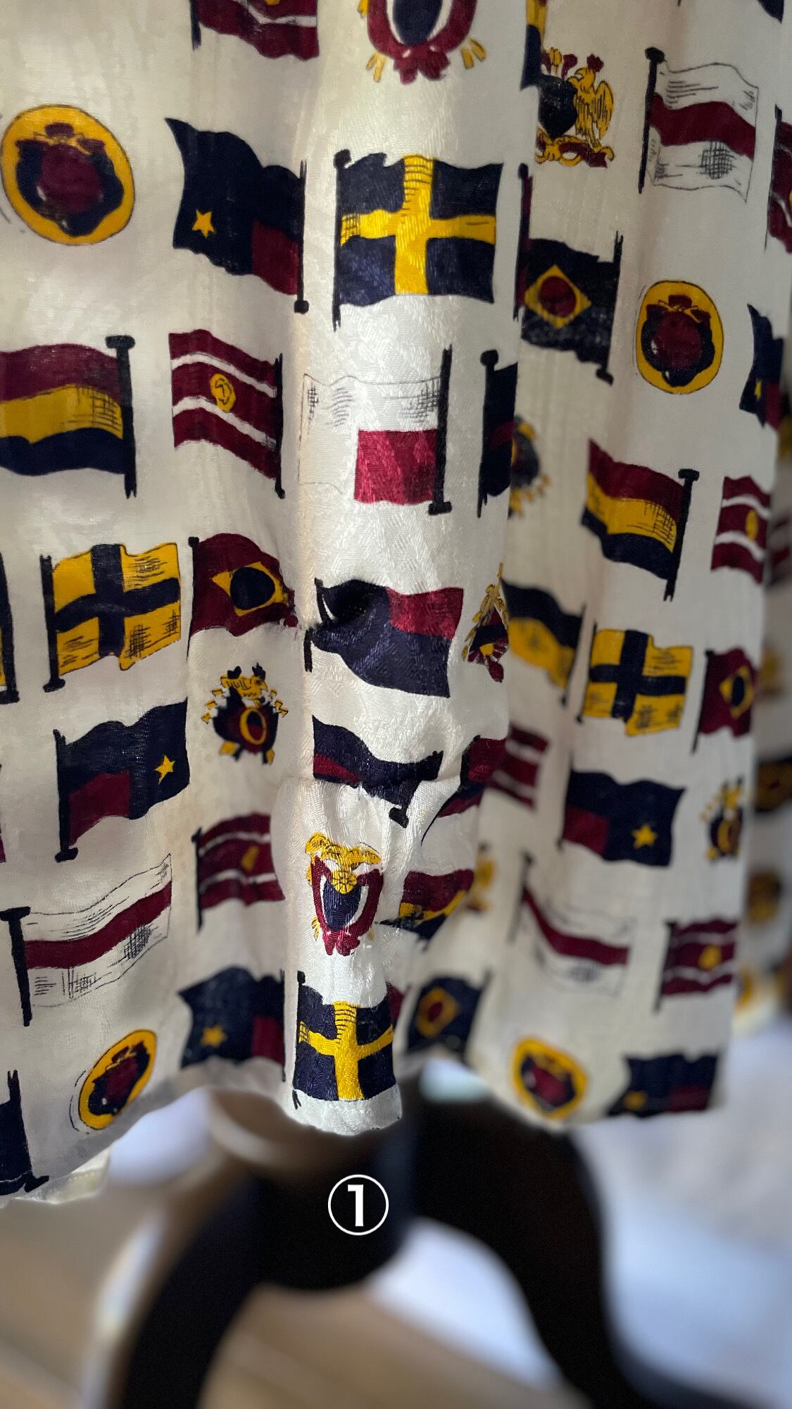 ①後ろ裾近くに三箇所破れをリペアした部分があり、そのためくしゅっと上がるようにシルエットが乱れています。