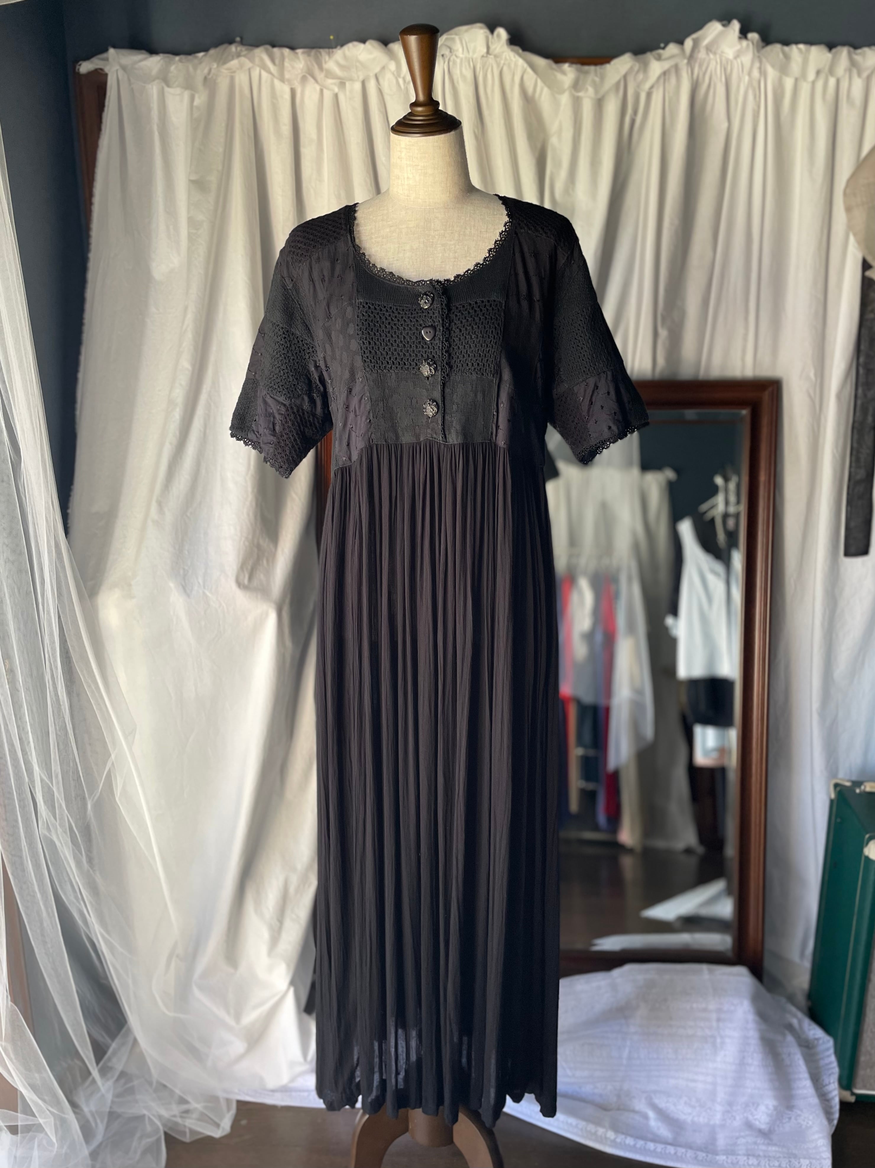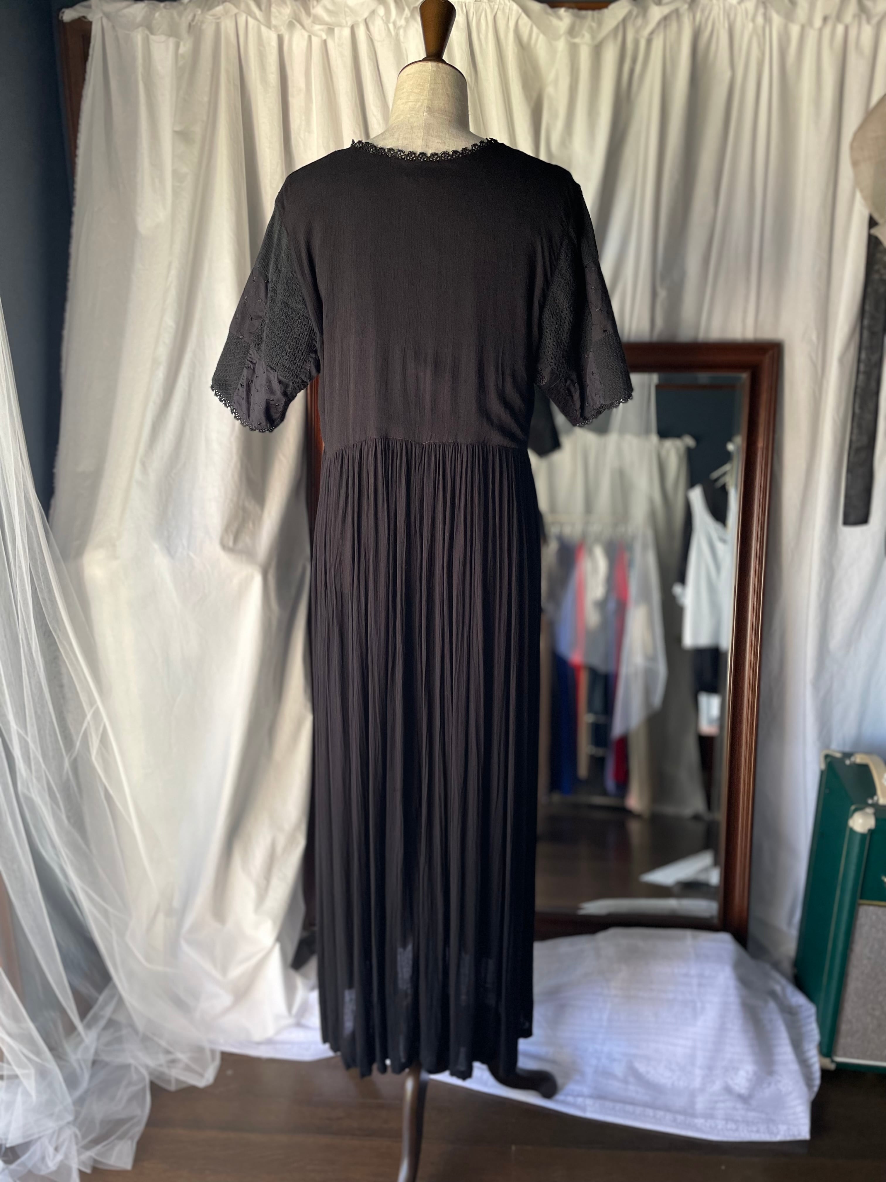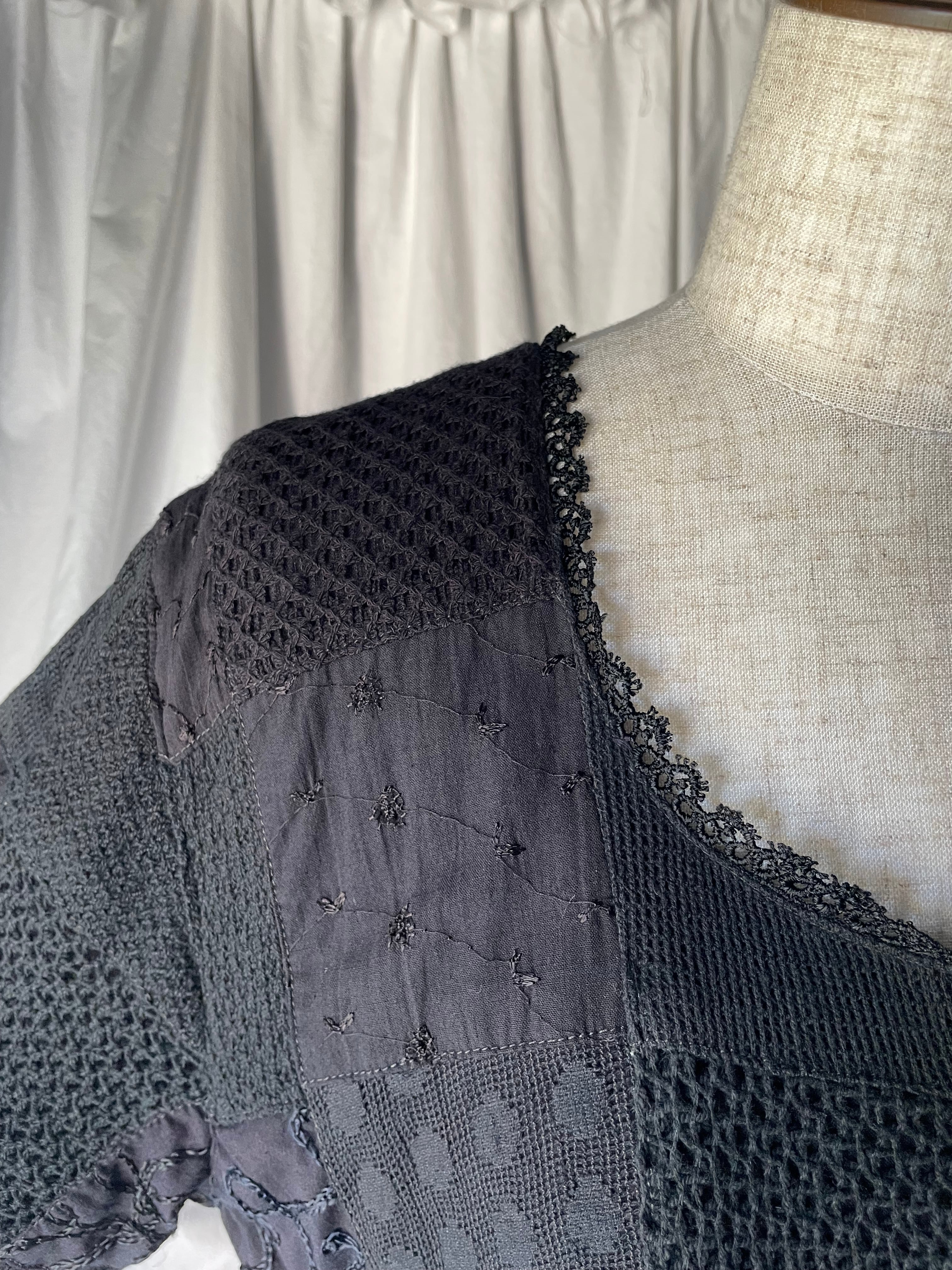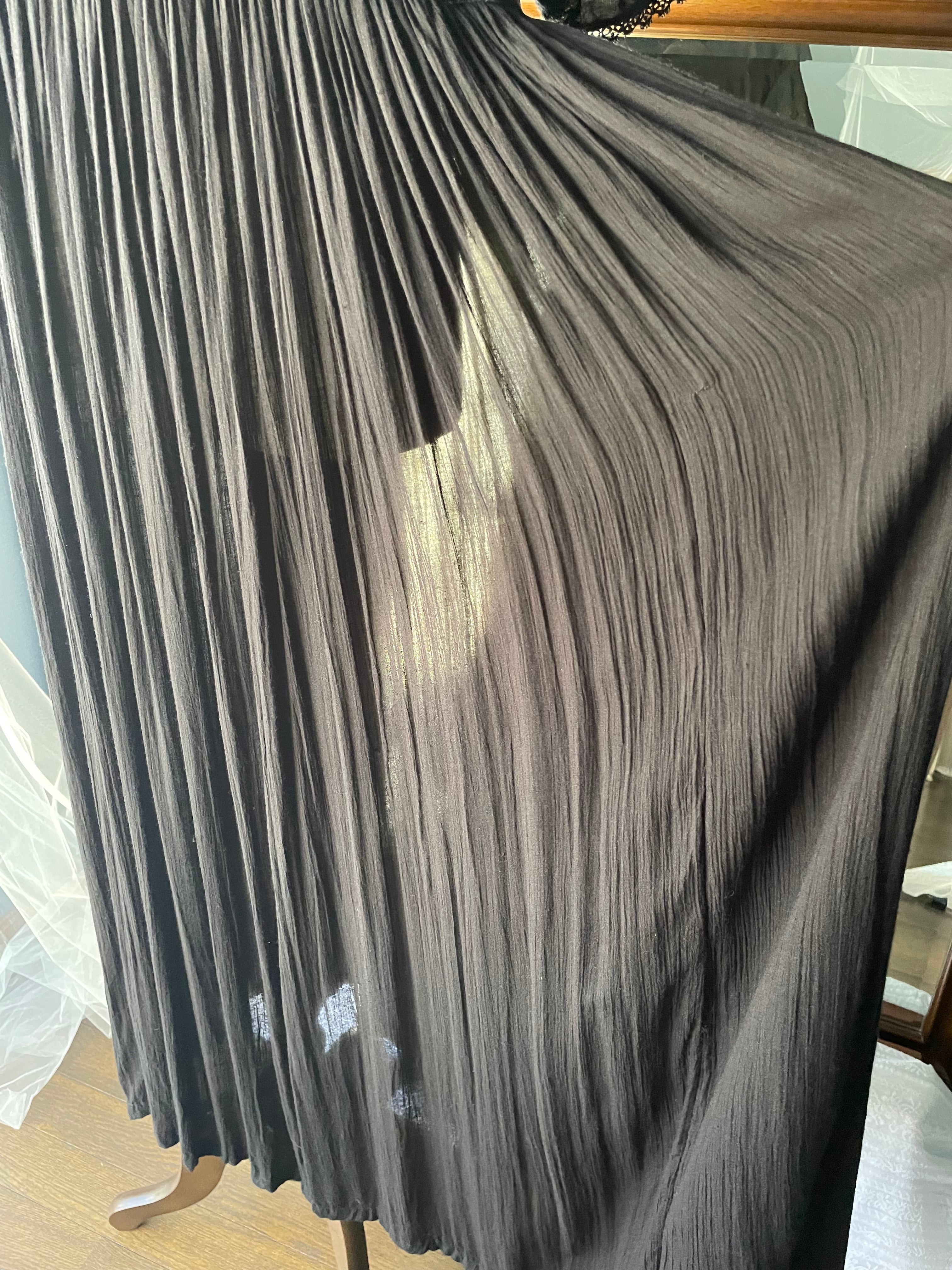 スカート部分も軽やかで、黒ですが重たくなく、色とまた衿元も広めに開いているので甘さも強くなく着ていただきやすい一着かと思います。