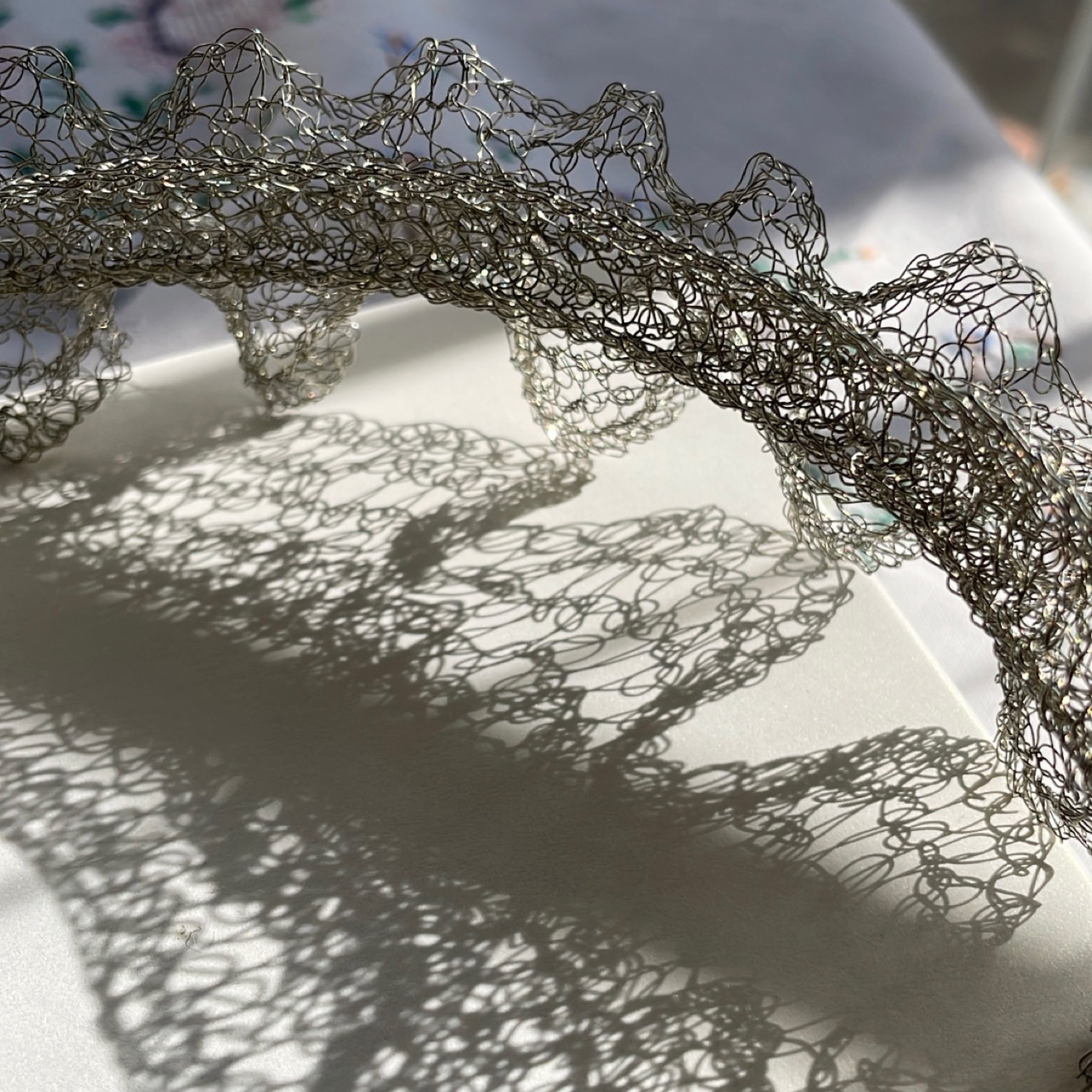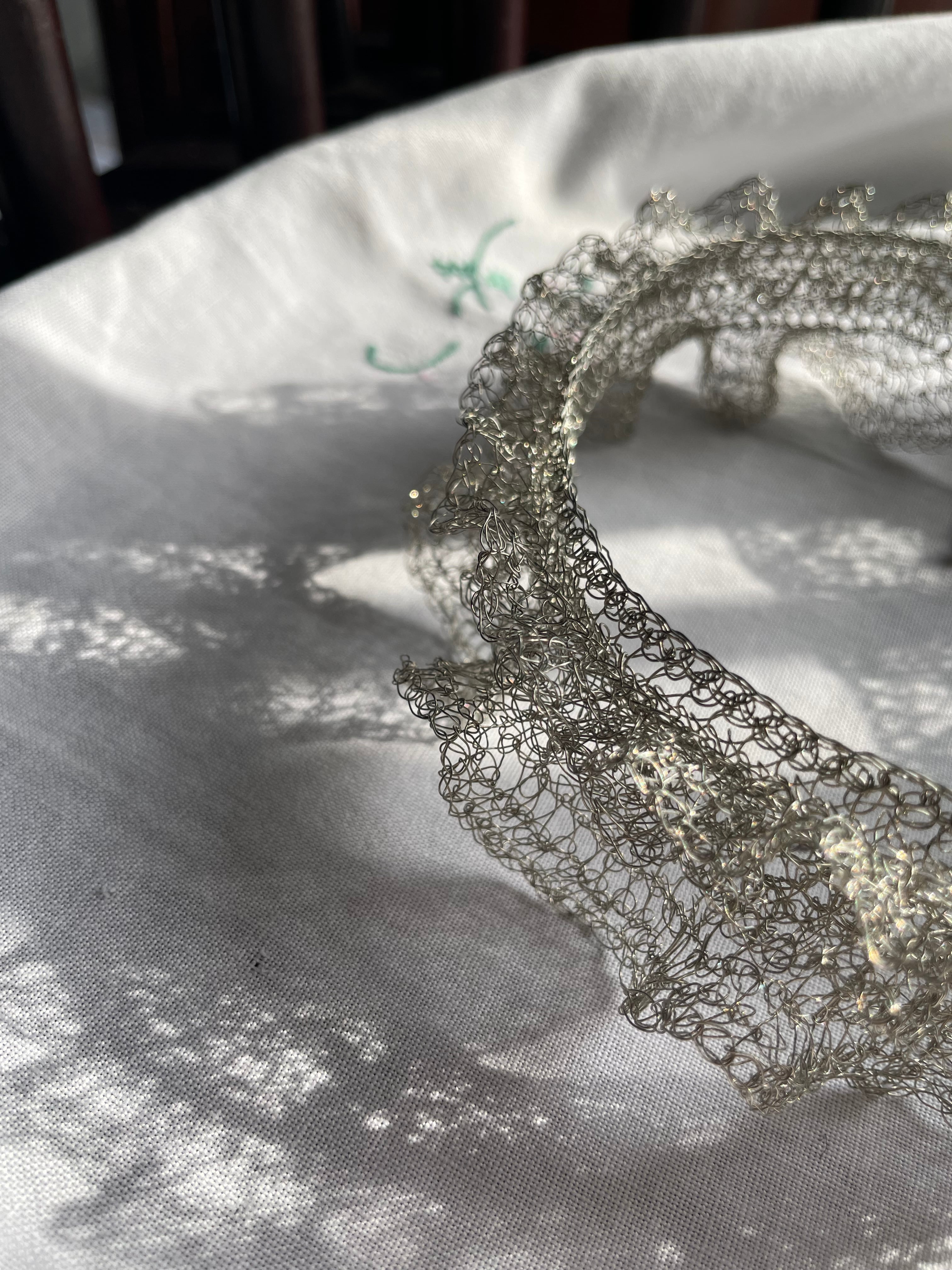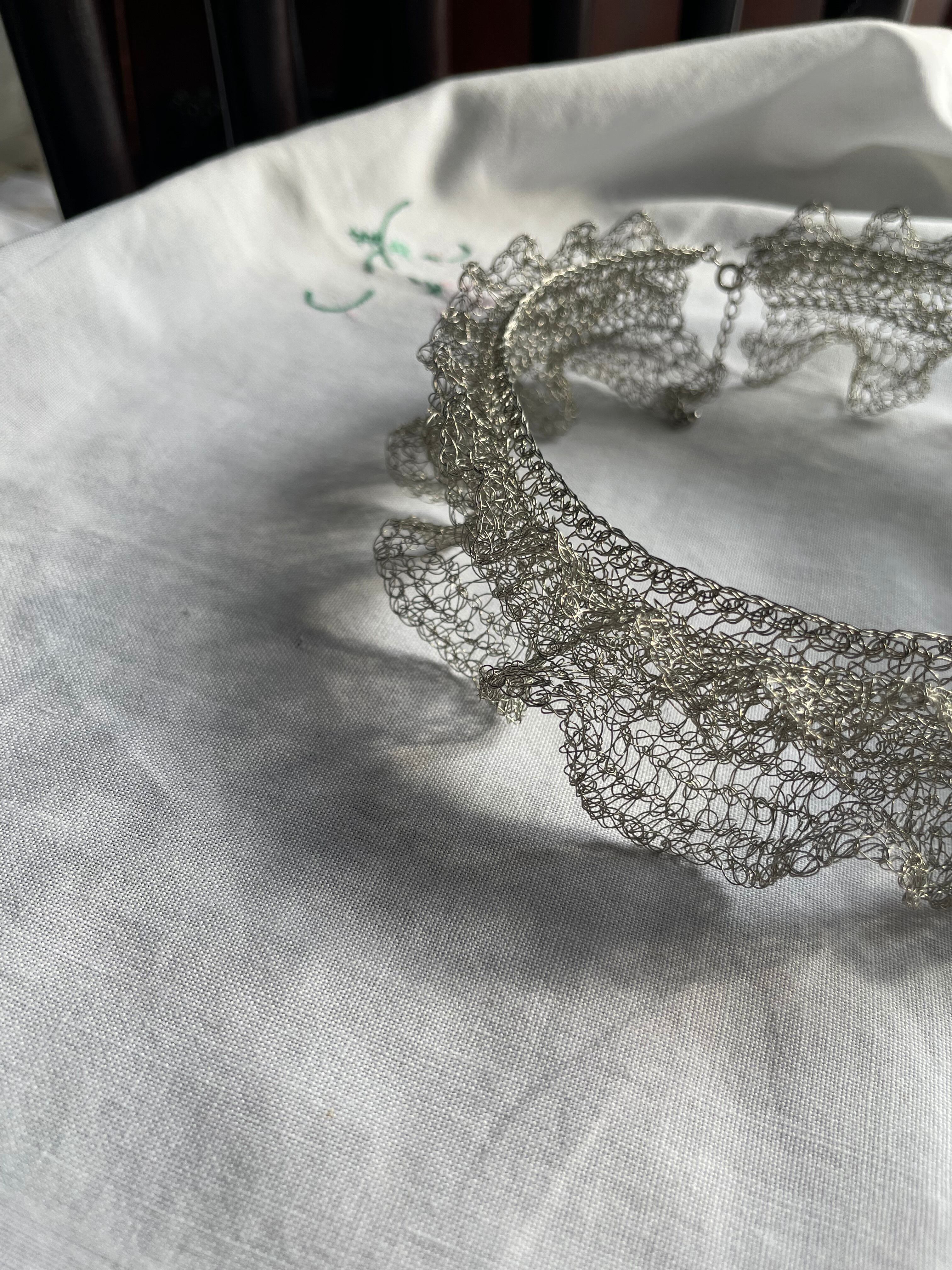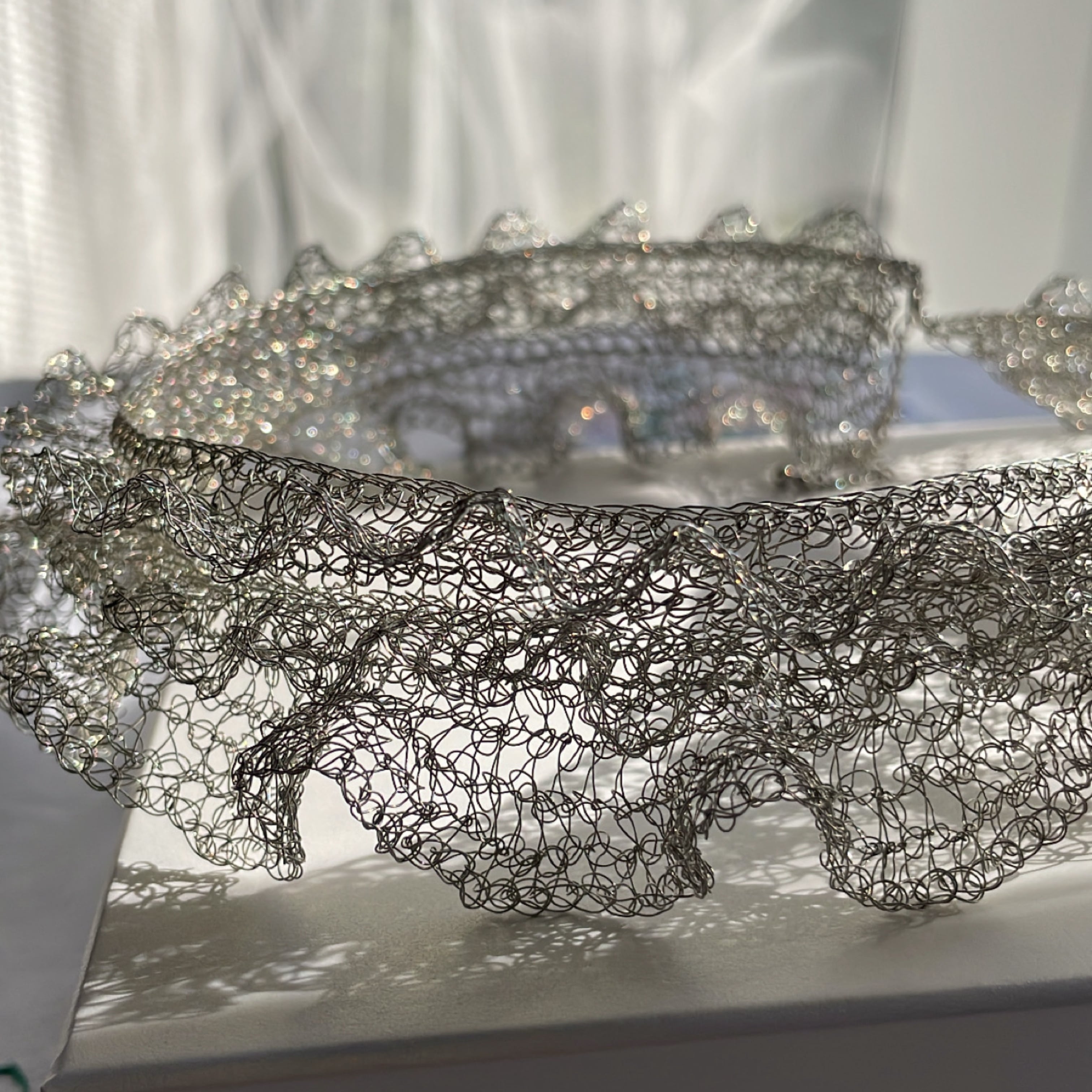 線状になった金属を手編みする事で、立体に空間と弾力が生まれる面白さにはまり、工業用ワイヤーを手編みした透け感のあるアクセサリーやオブジェ等の制作。