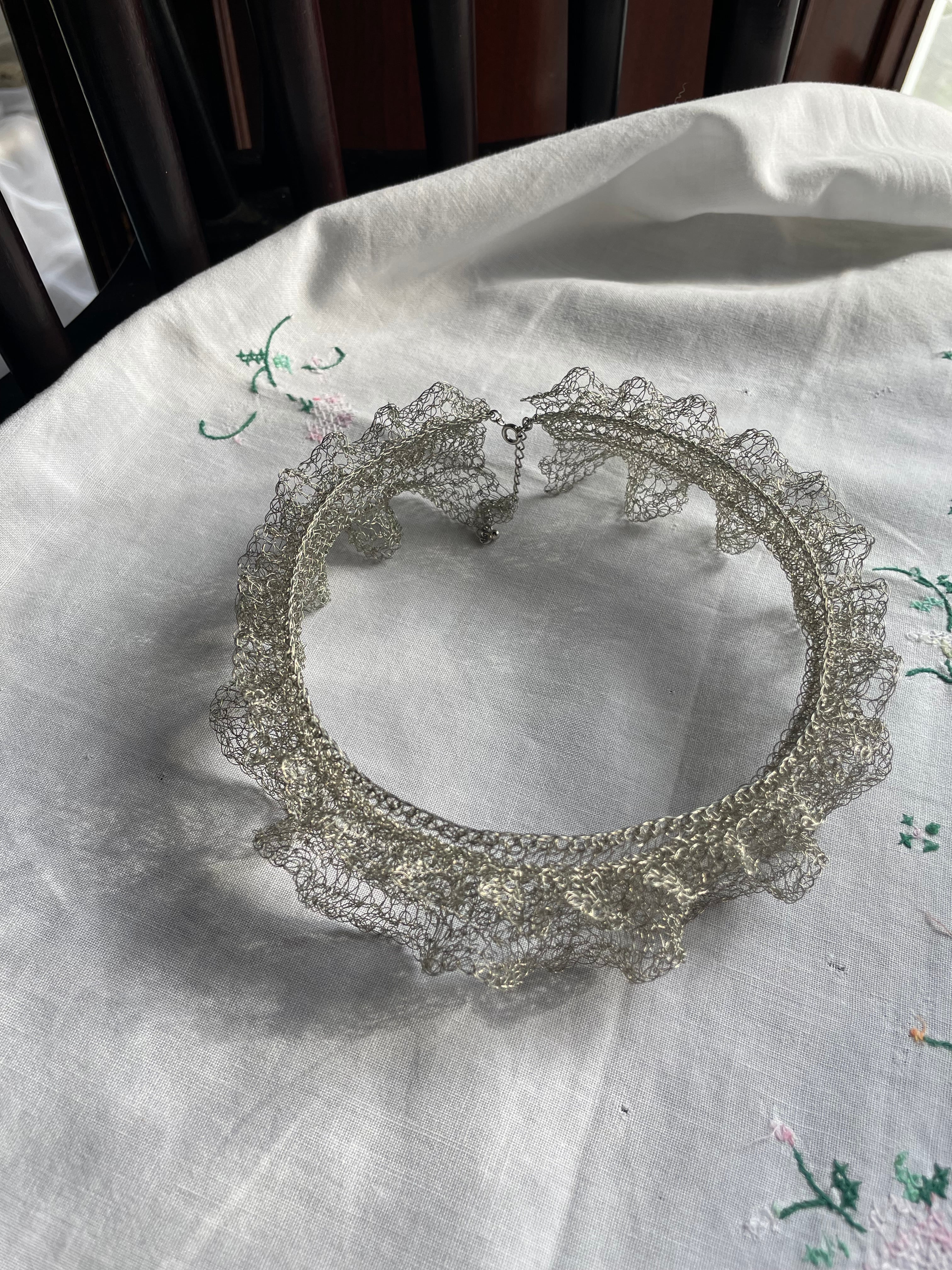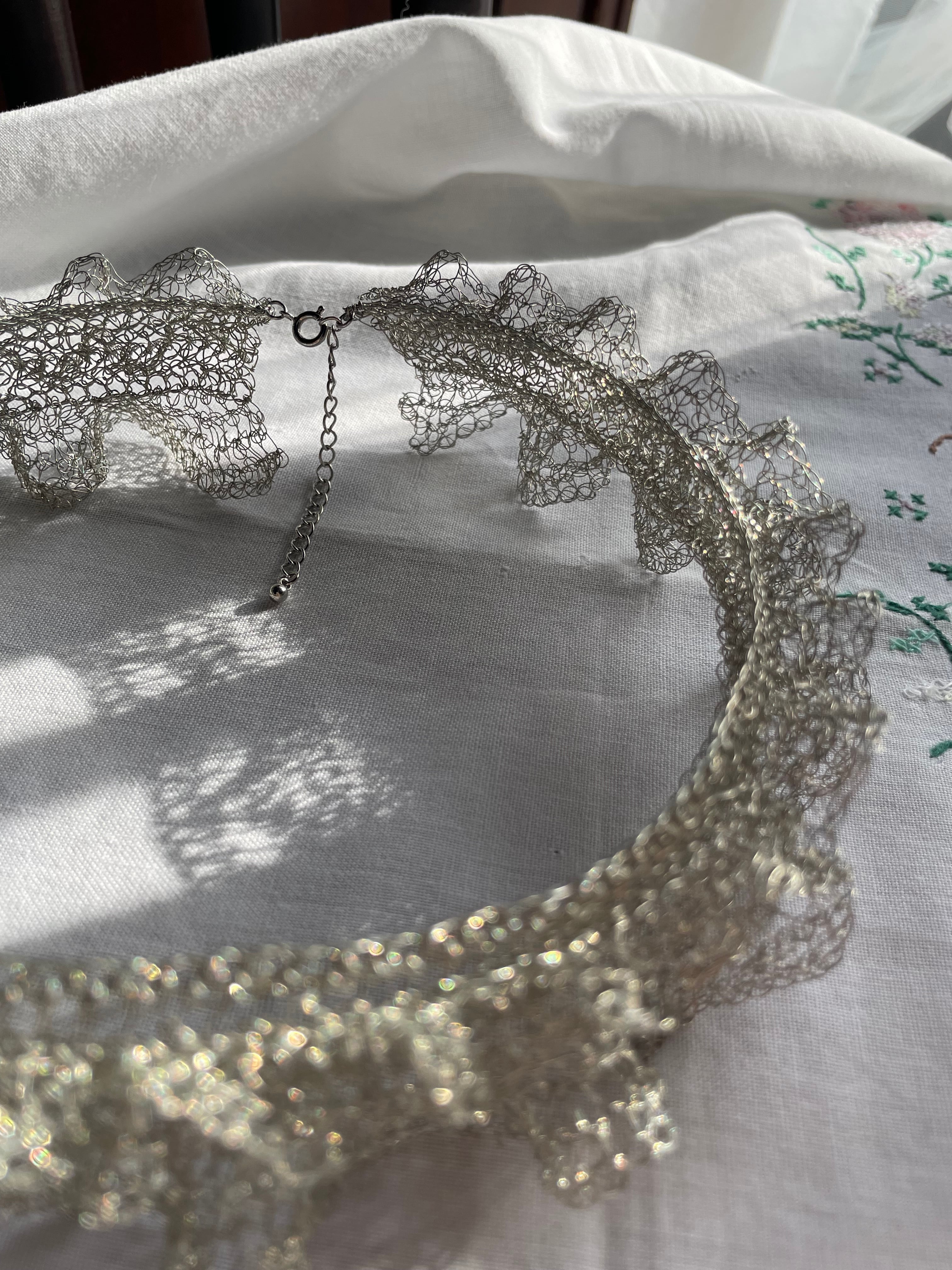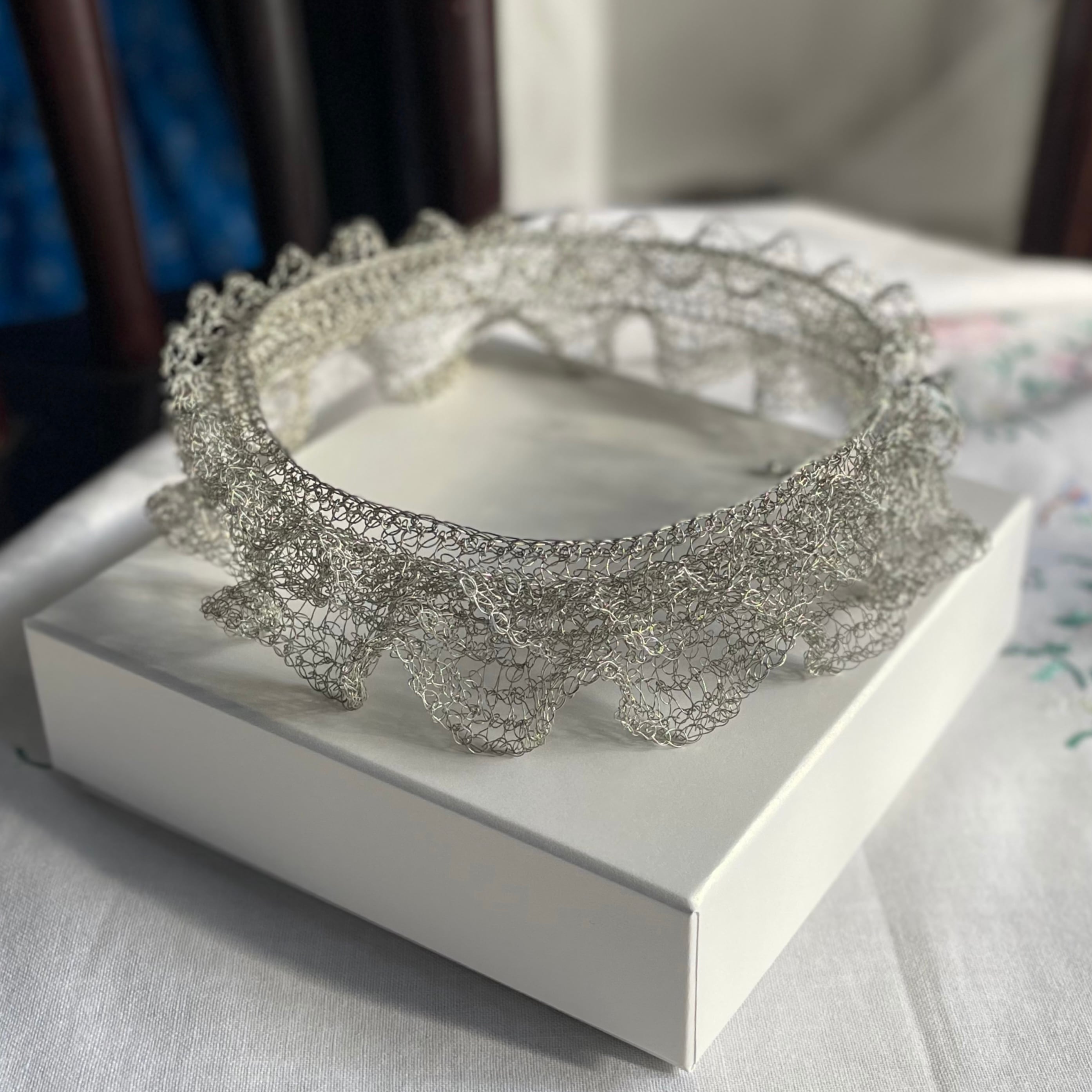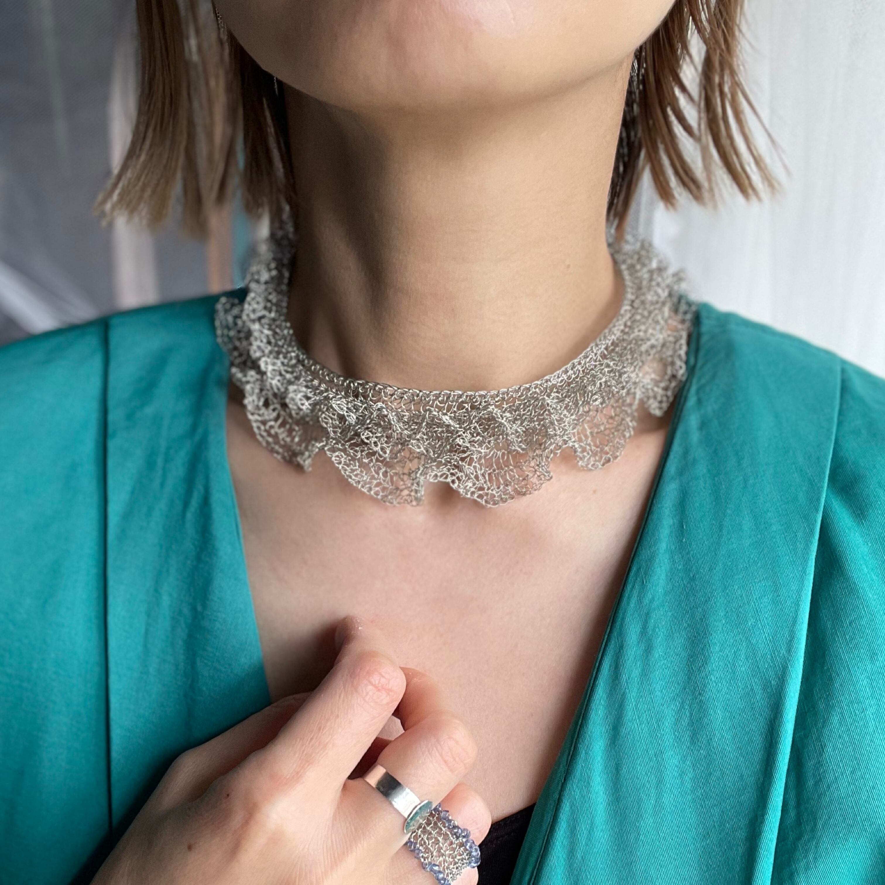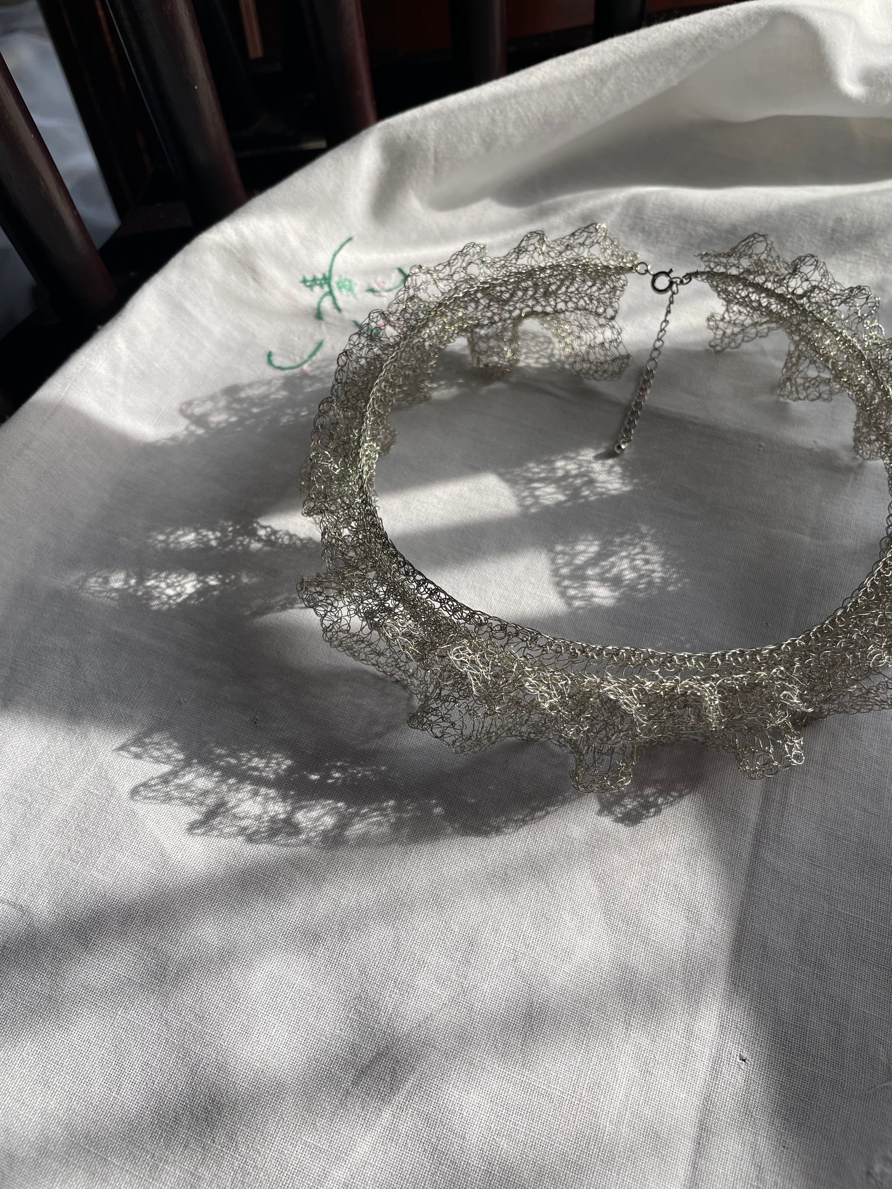 線状になった金属を手編みする事で、立体に空間と弾力が生まれる面白さにはまり、工業用ワイヤーを手編みした透け感のあるアクセサリーやオブジェ等の制作。
