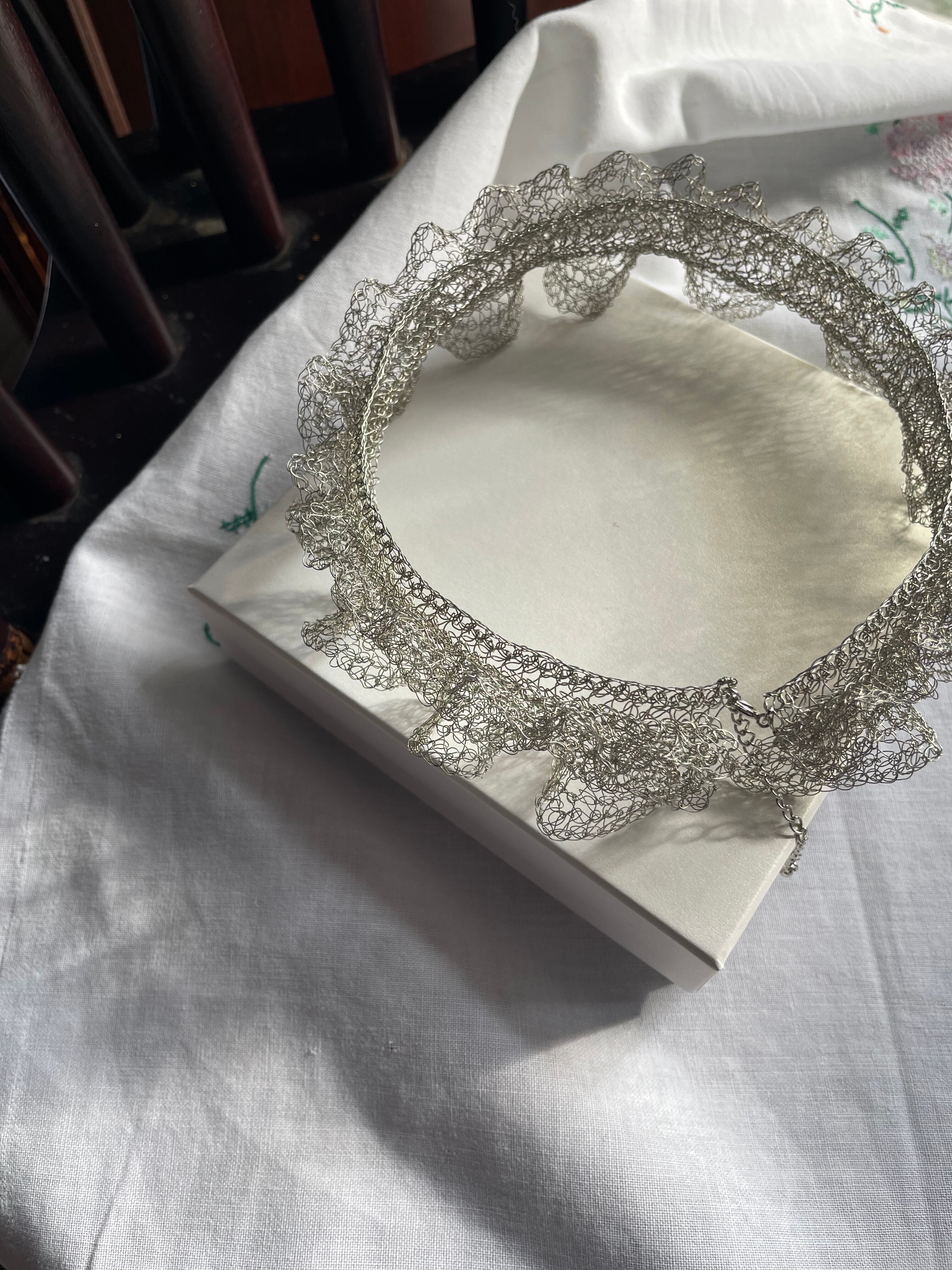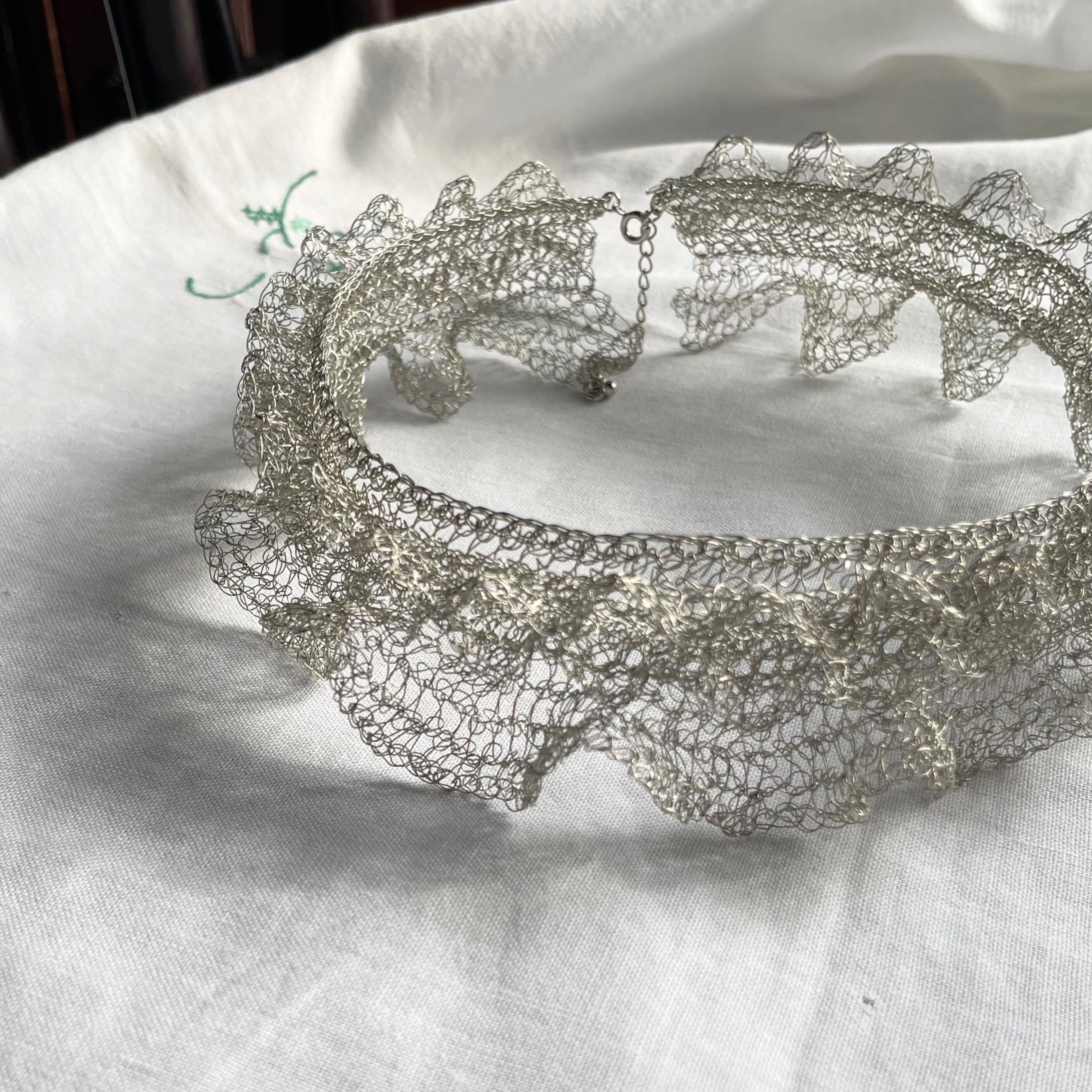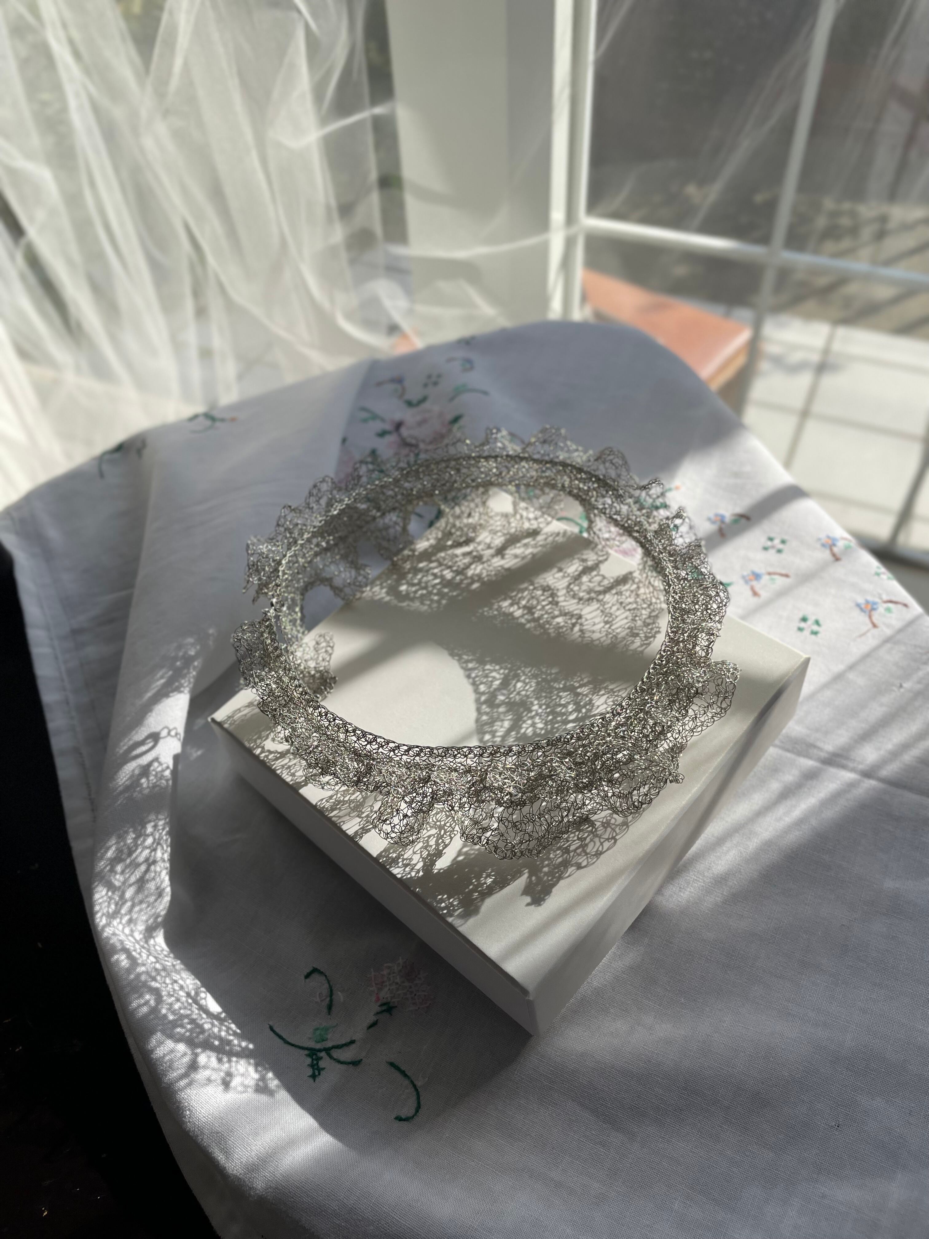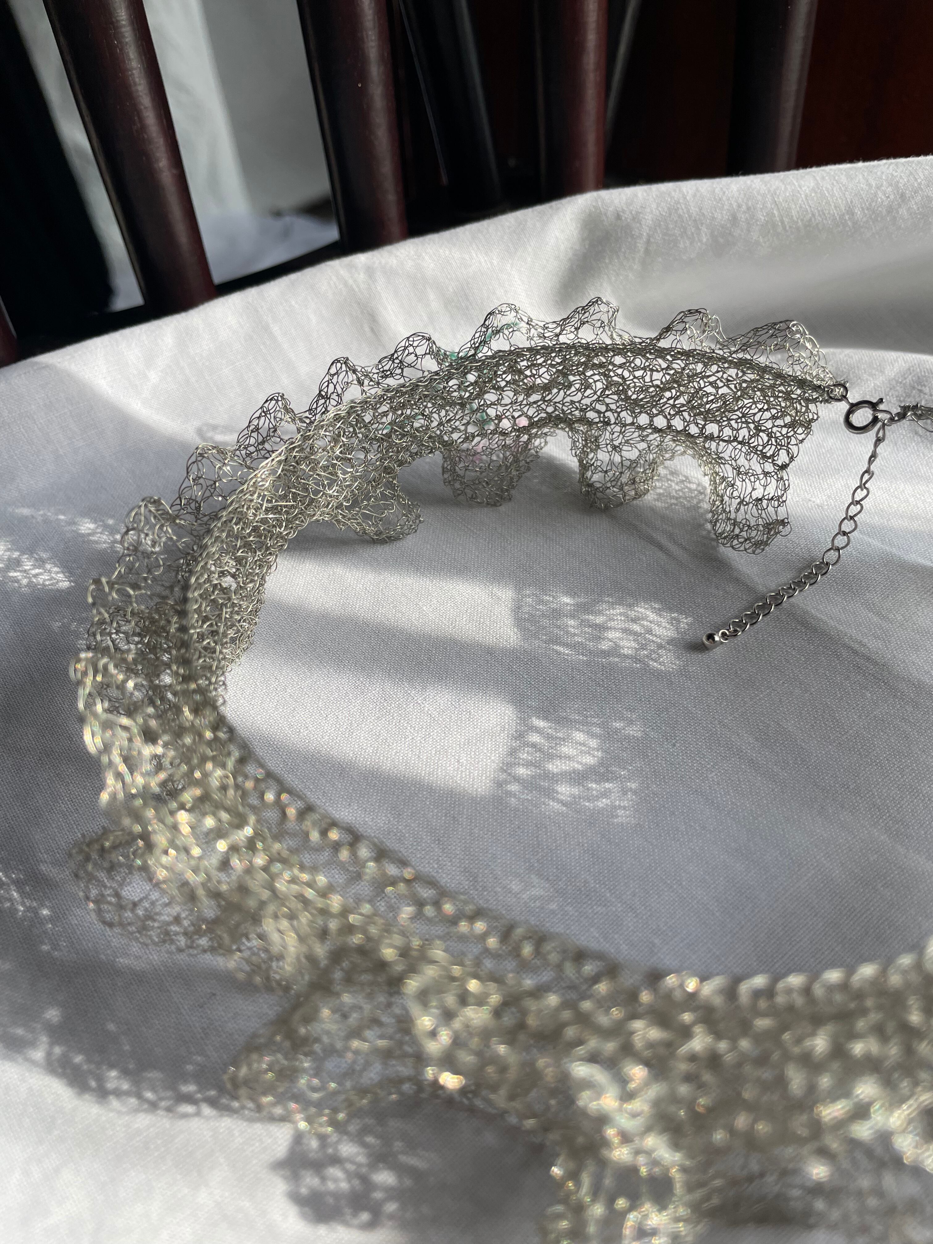 線状になった金属を手編みする事で、立体に空間と弾力が生まれる面白さにはまり、工業用ワイヤーを手編みした透け感のあるアクセサリーやオブジェ等の制作。