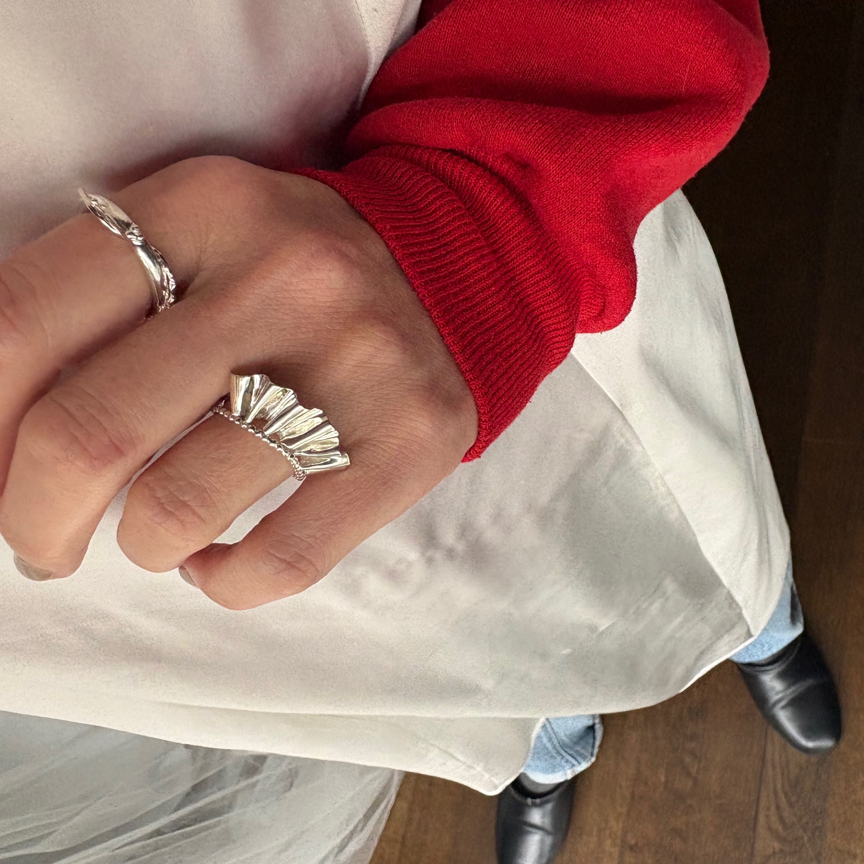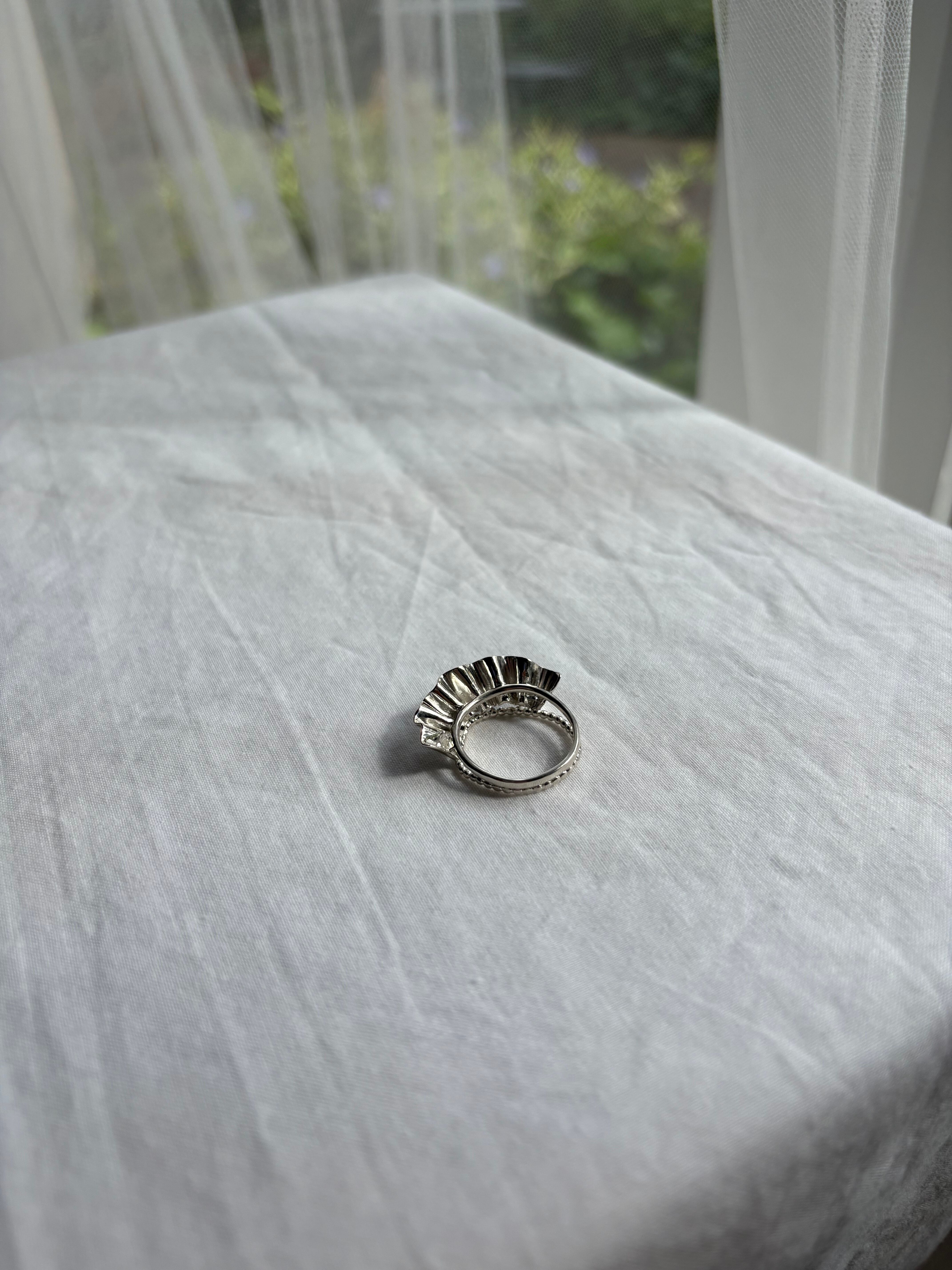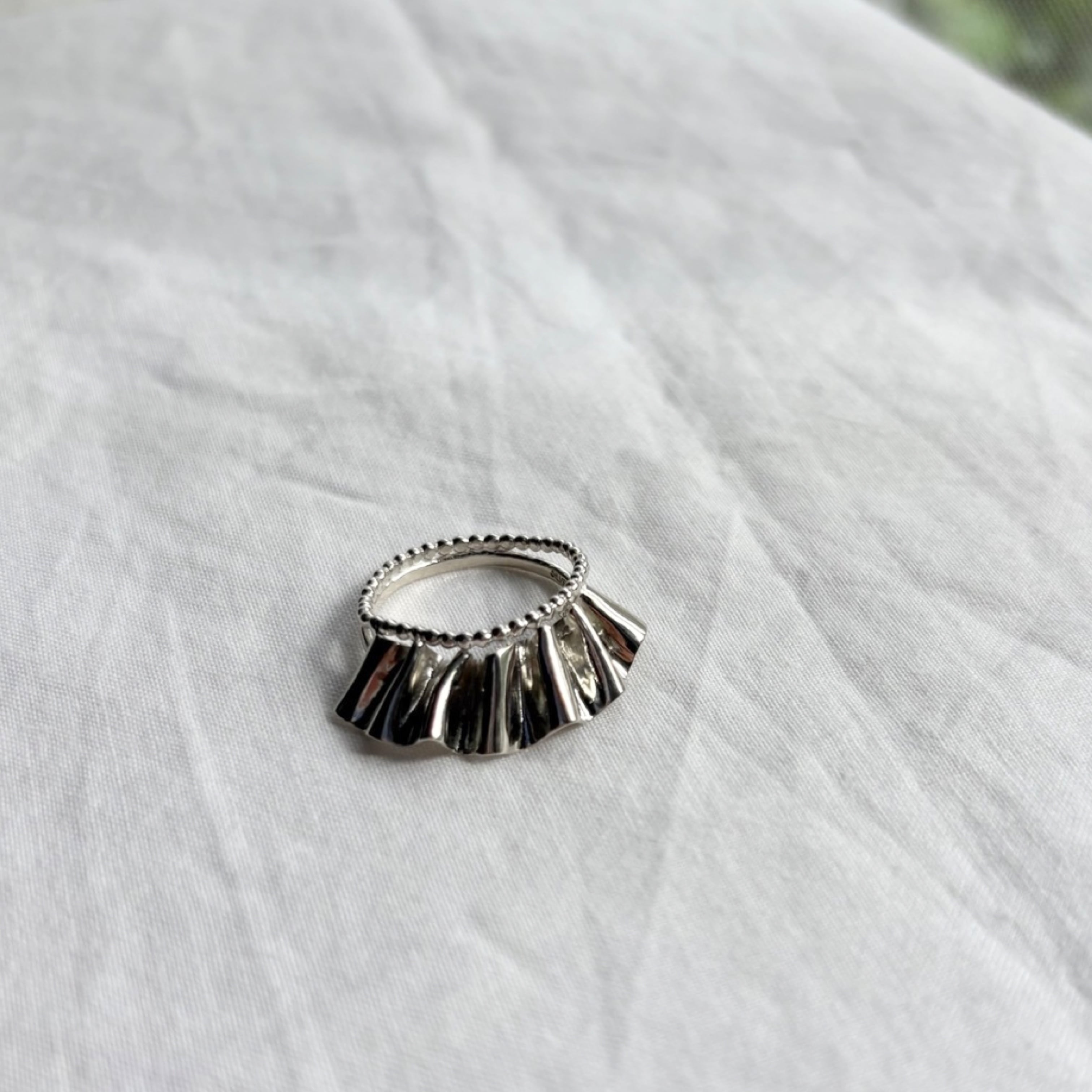 光を浴びてドレープが煌めく様がとても素敵なリングです。