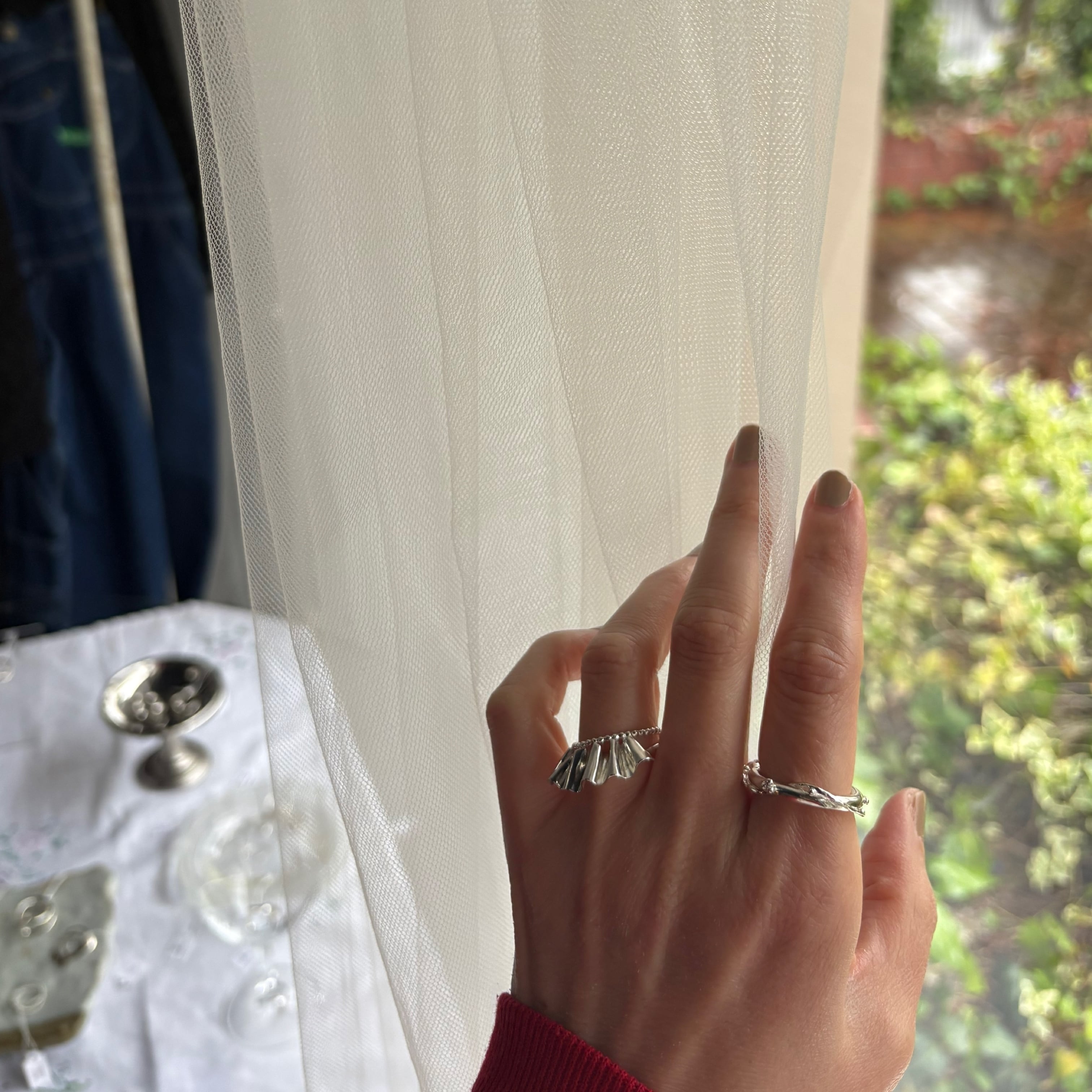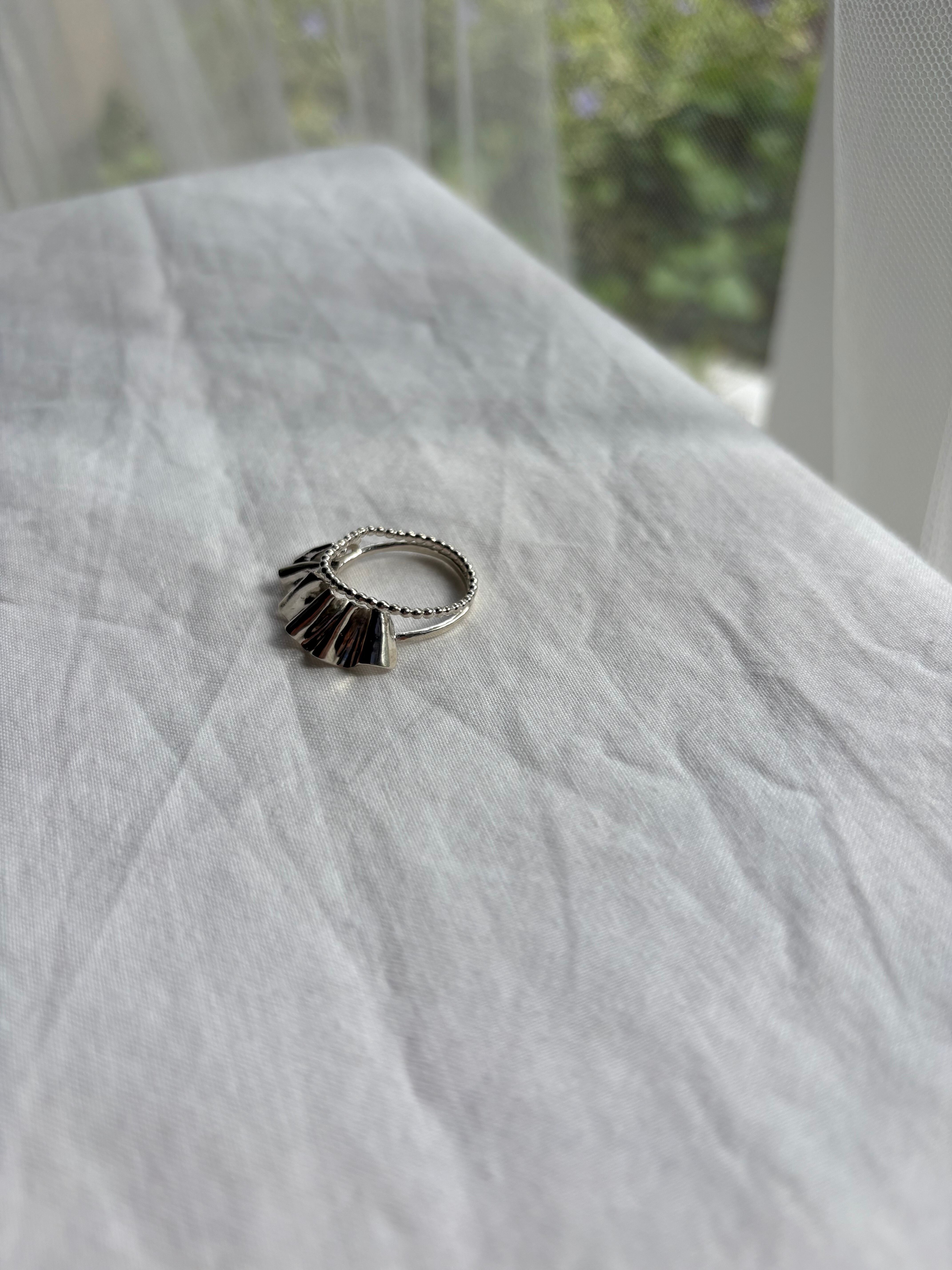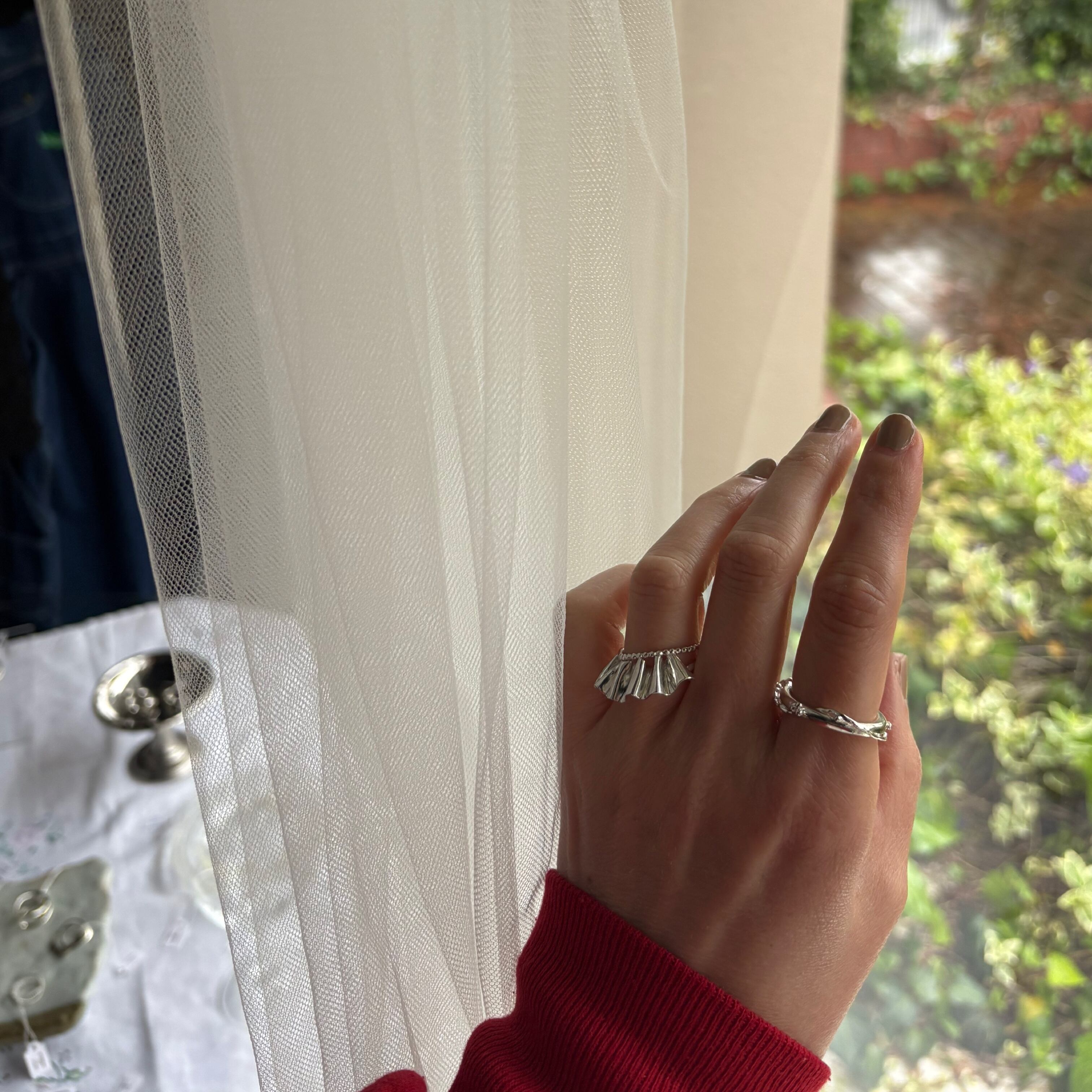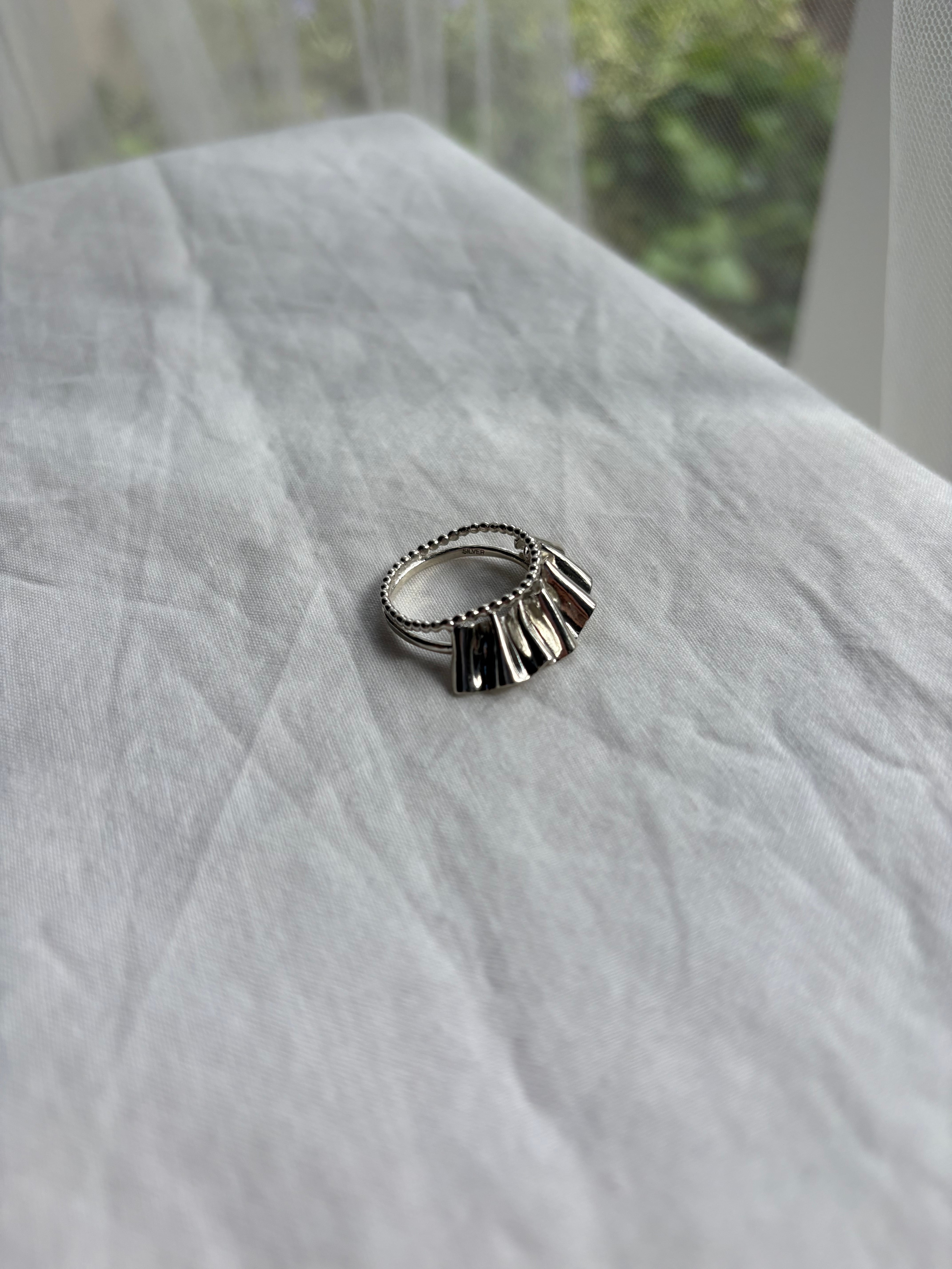 光を浴びてドレープが煌めく様がとても素敵なリングです。