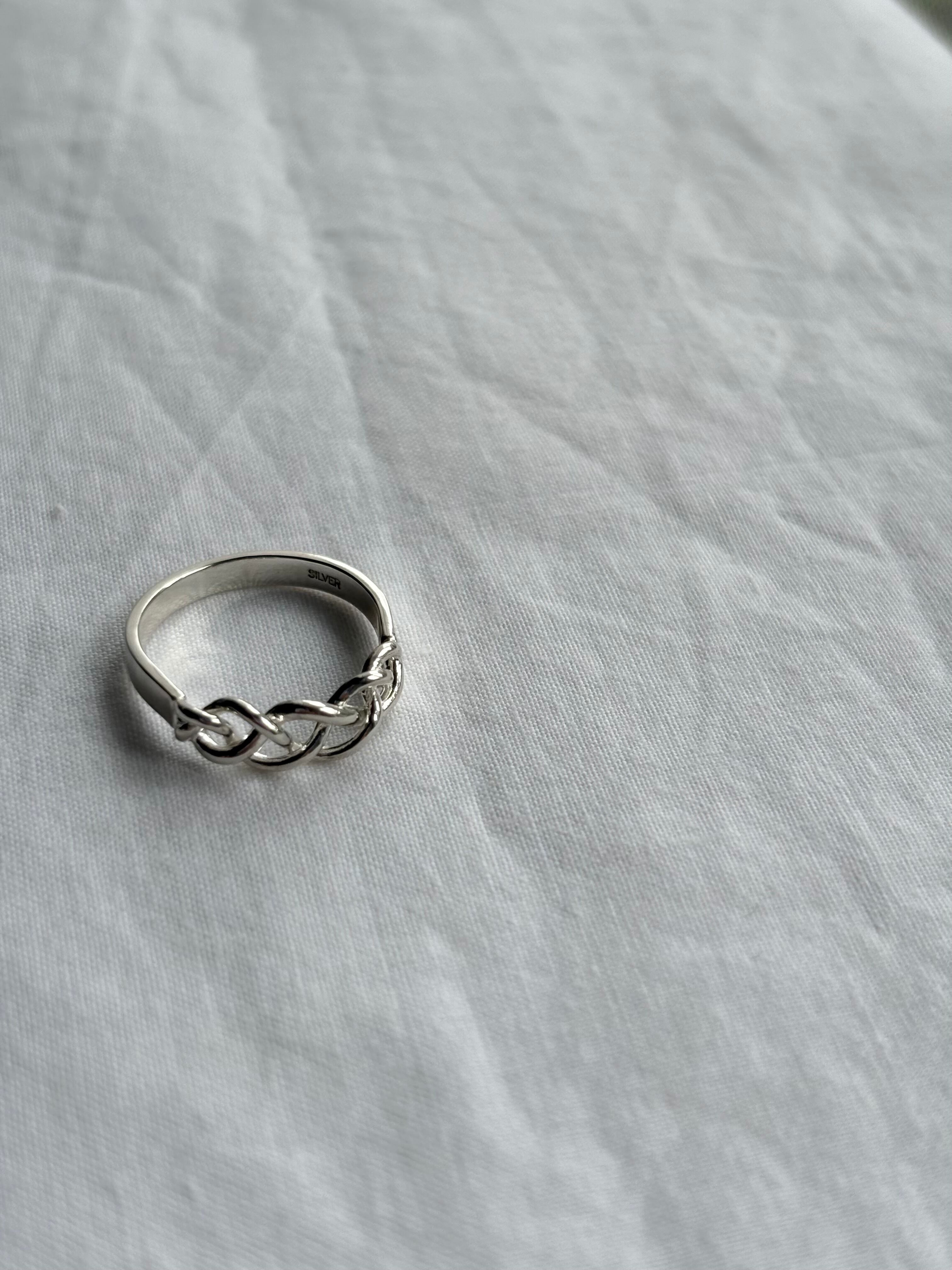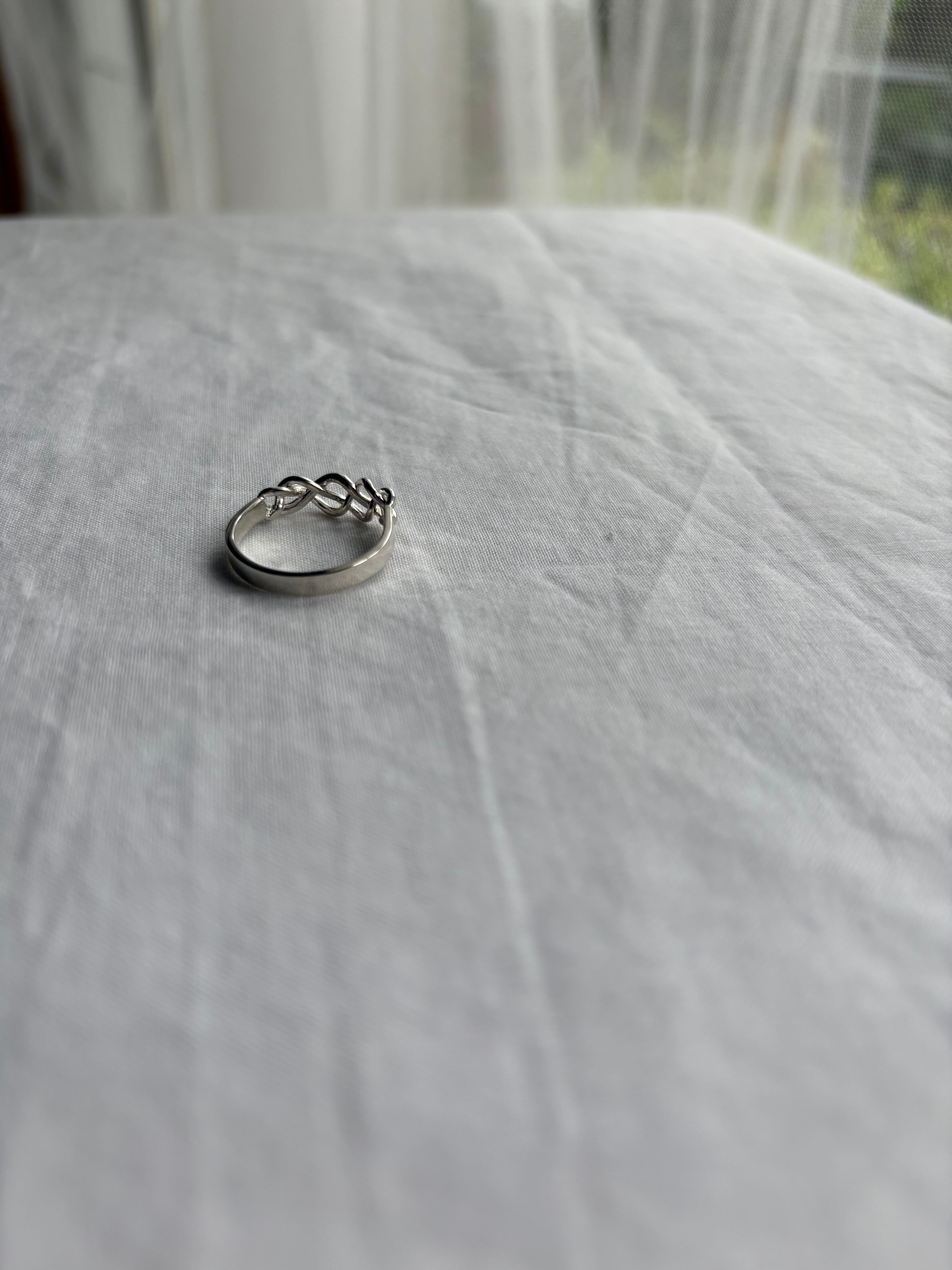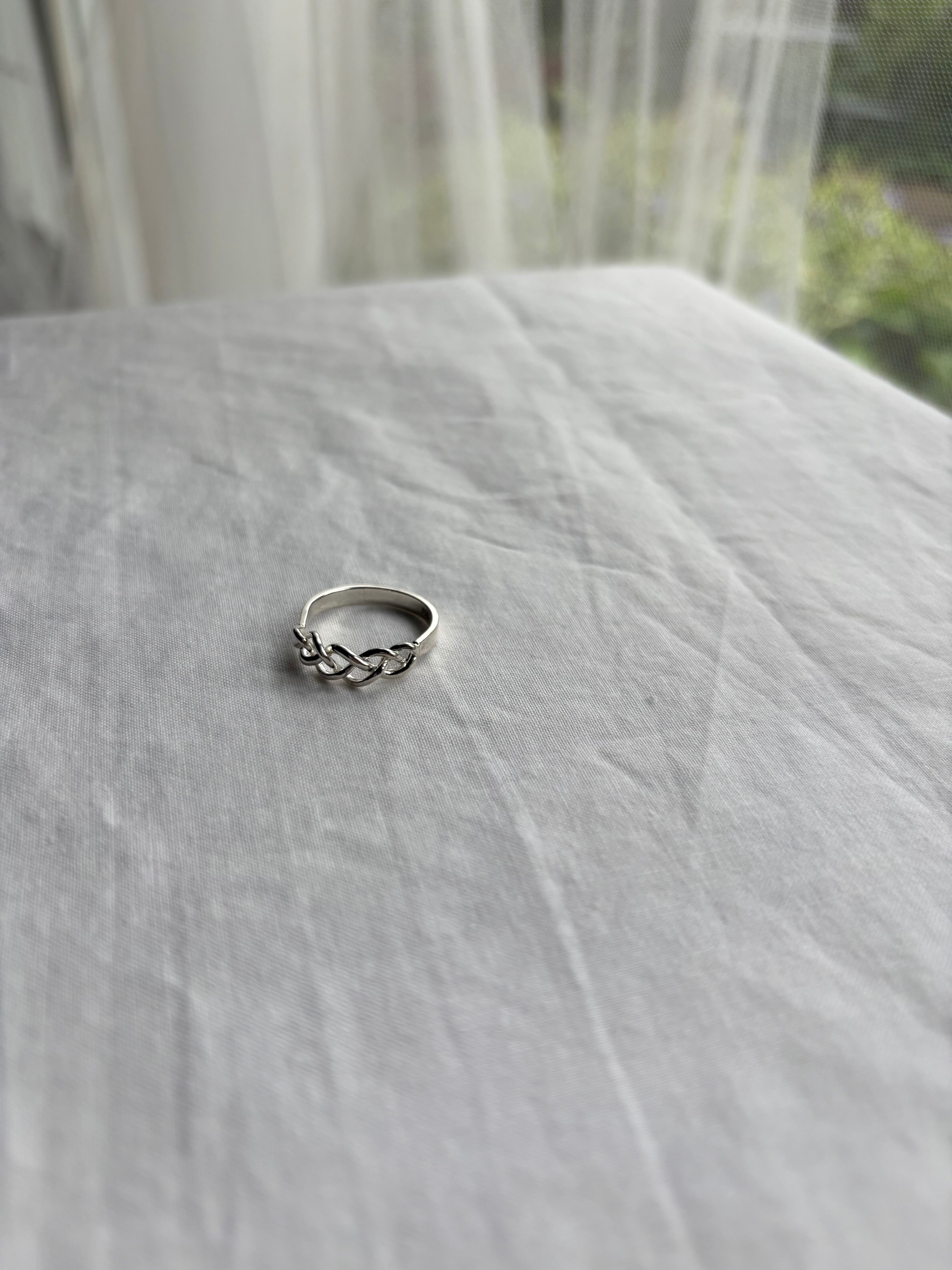 指に沿う三つ編みのように編み込まれたデザインが素敵なリング。