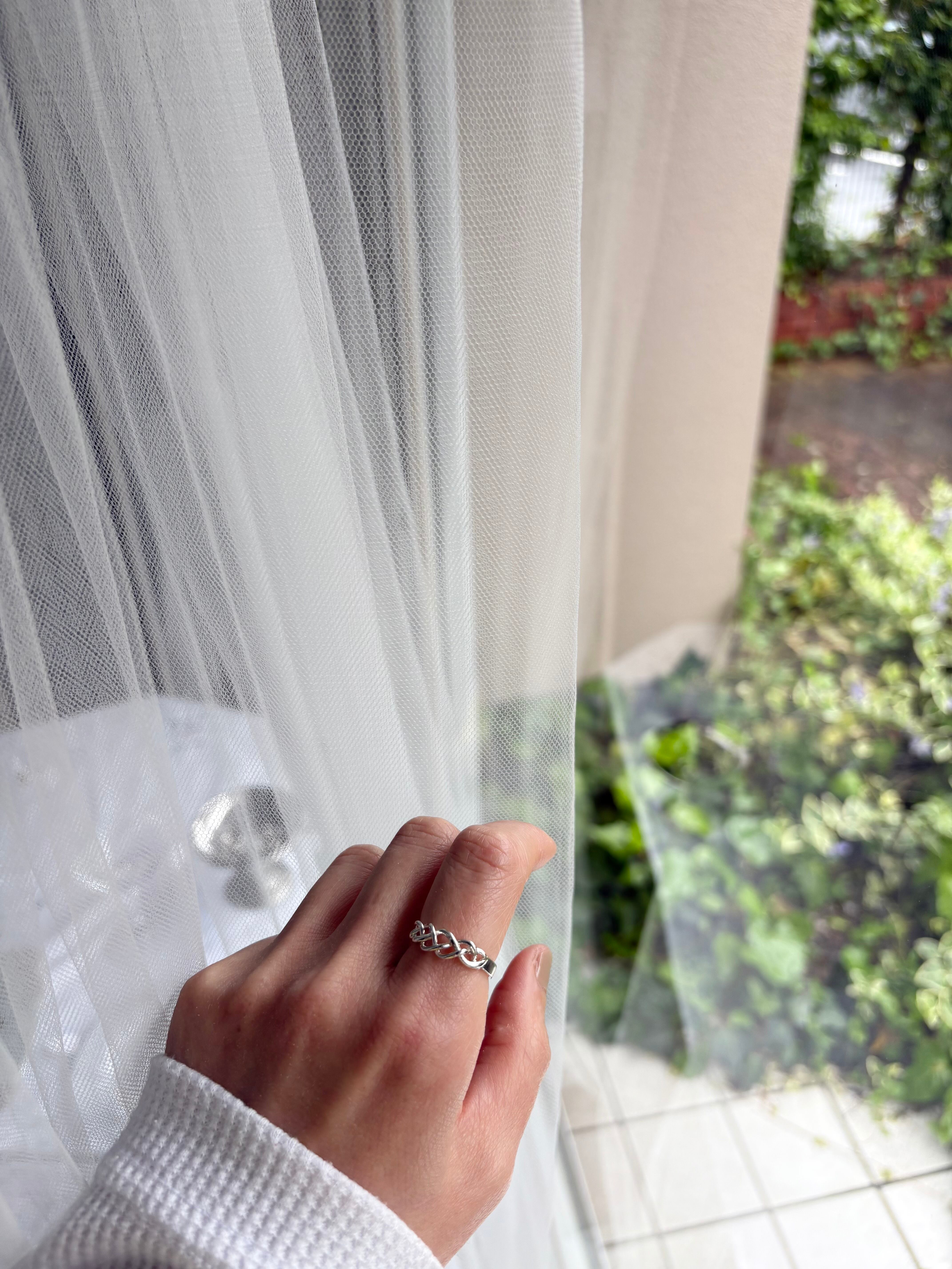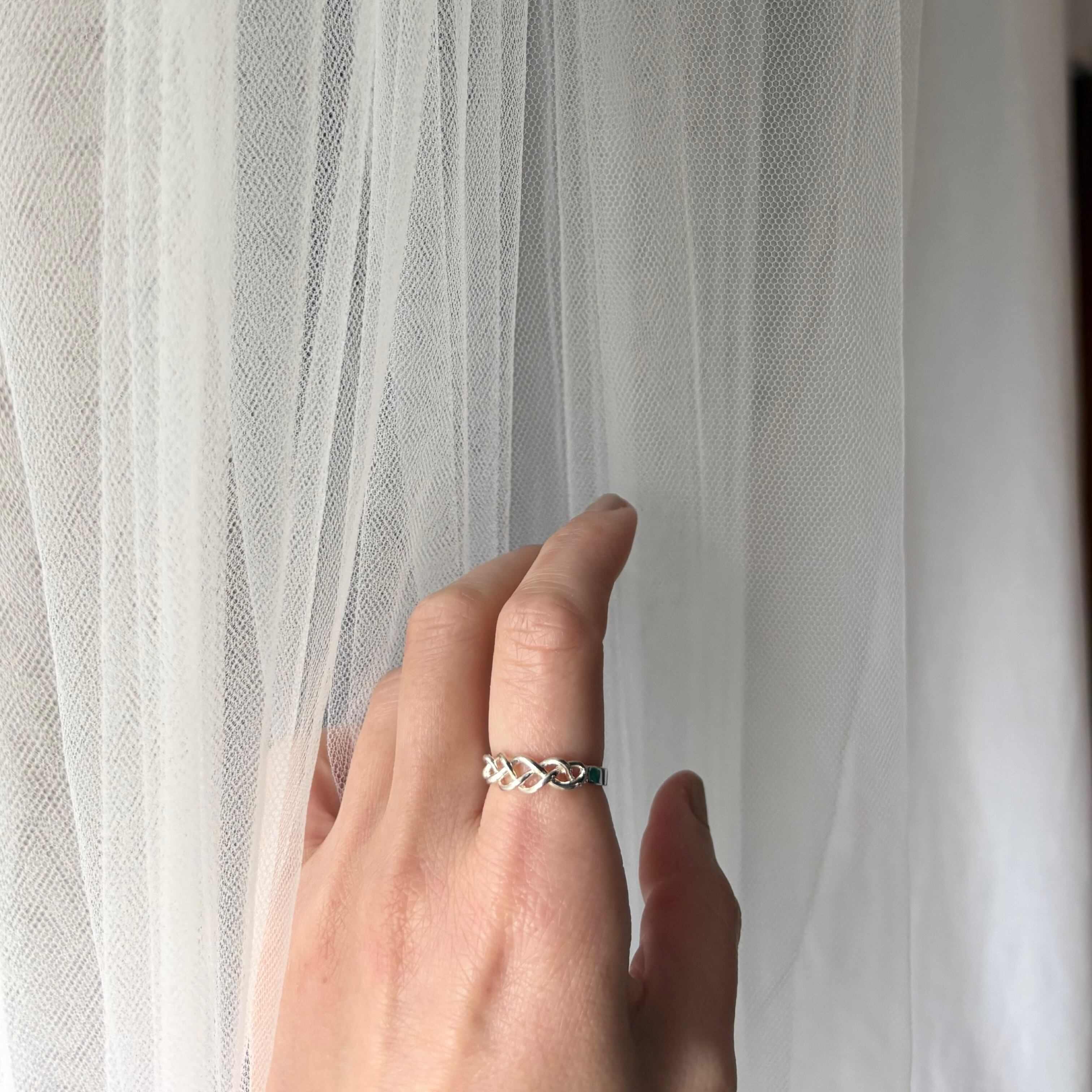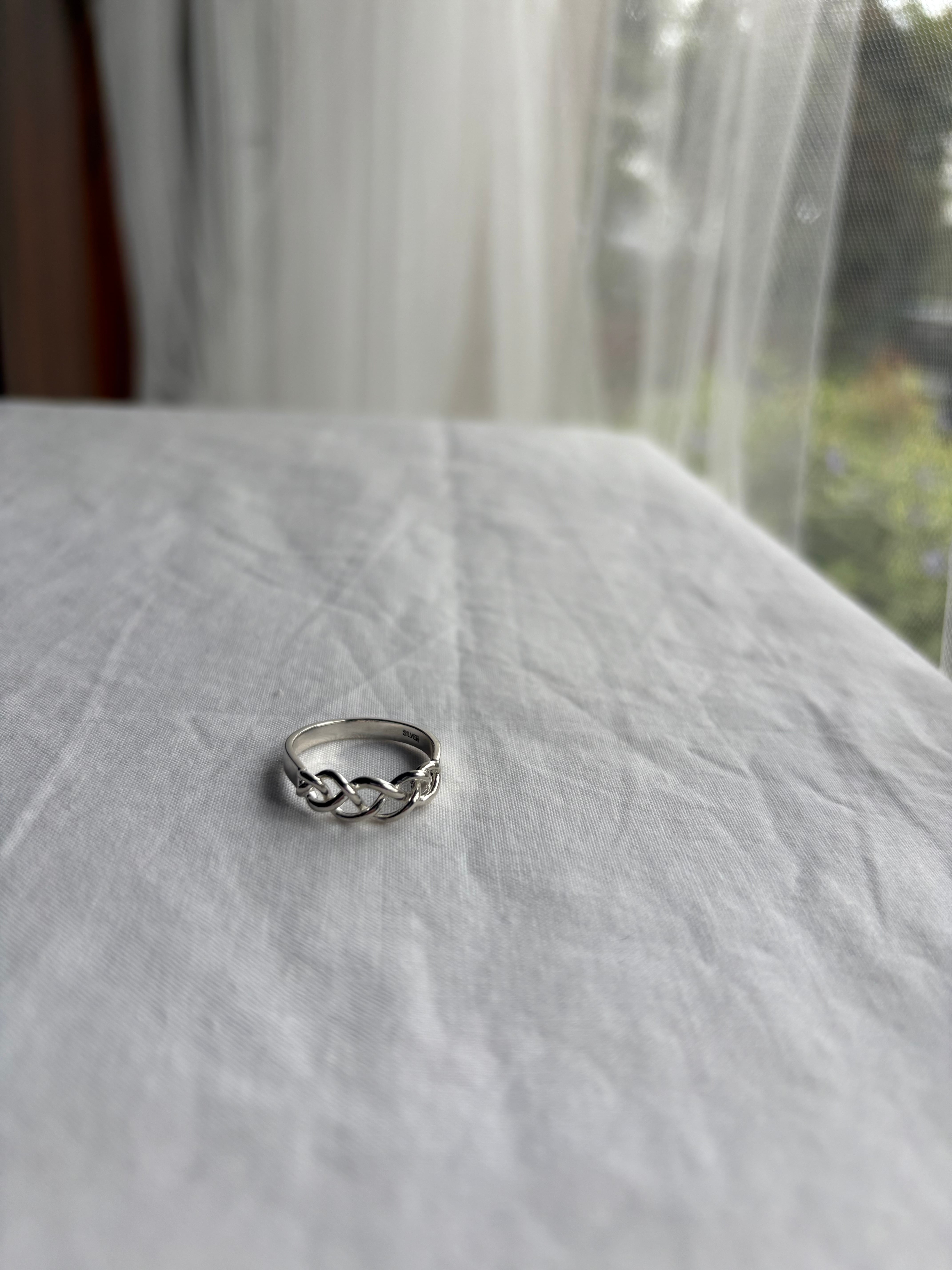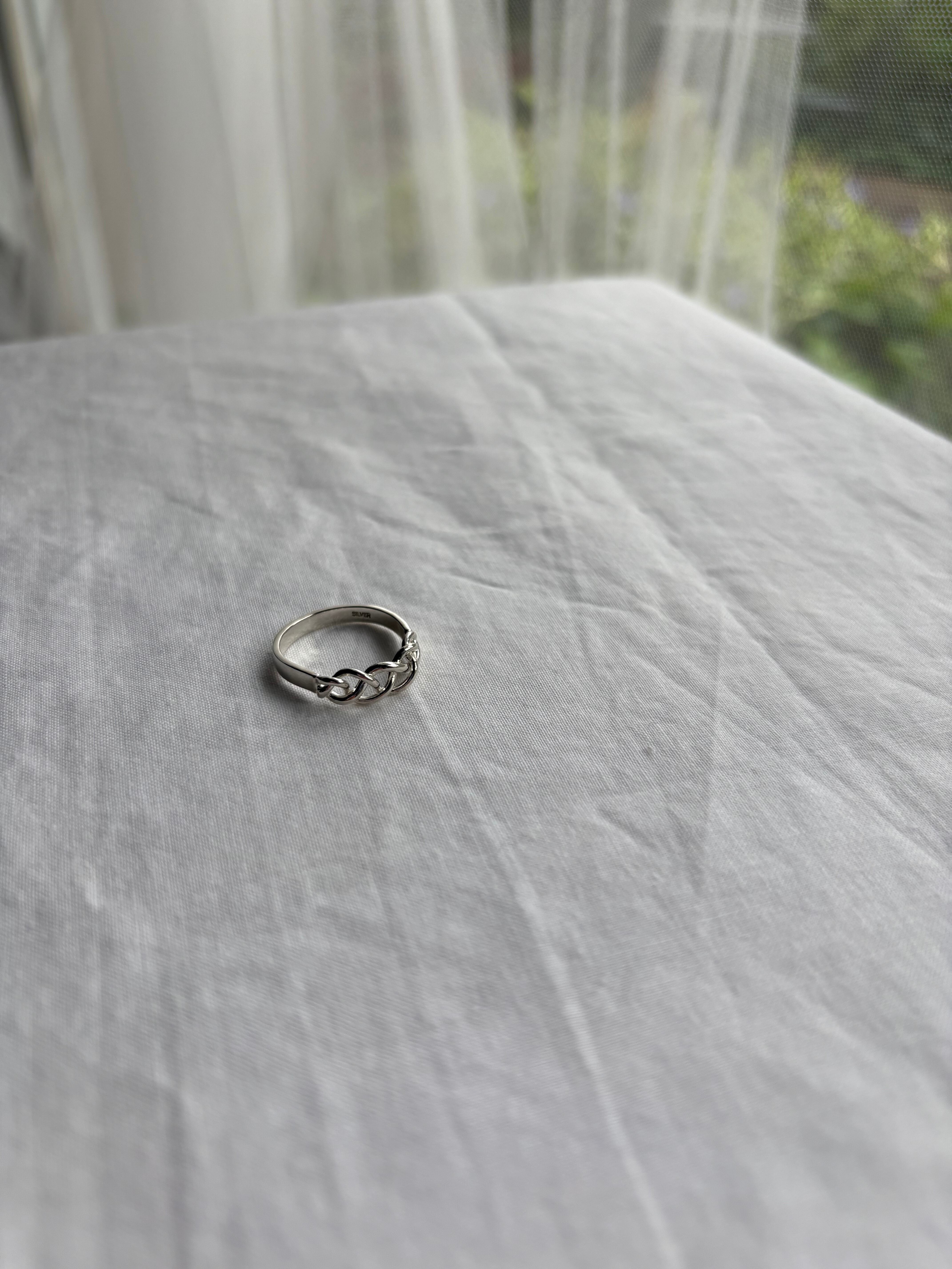 指に沿う三つ編みのように編み込まれたデザインが素敵なリング。