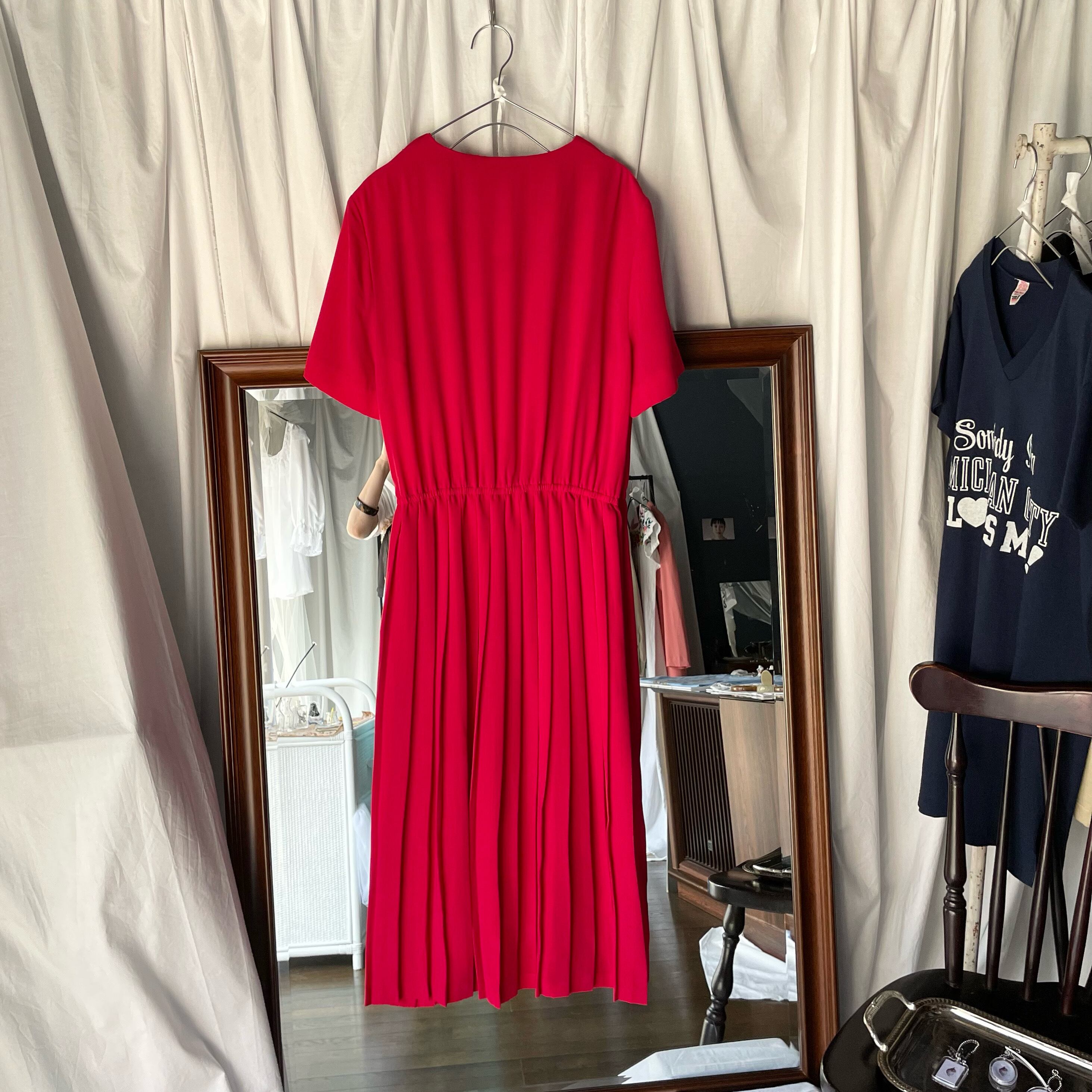 赤いプリーツワンピース。