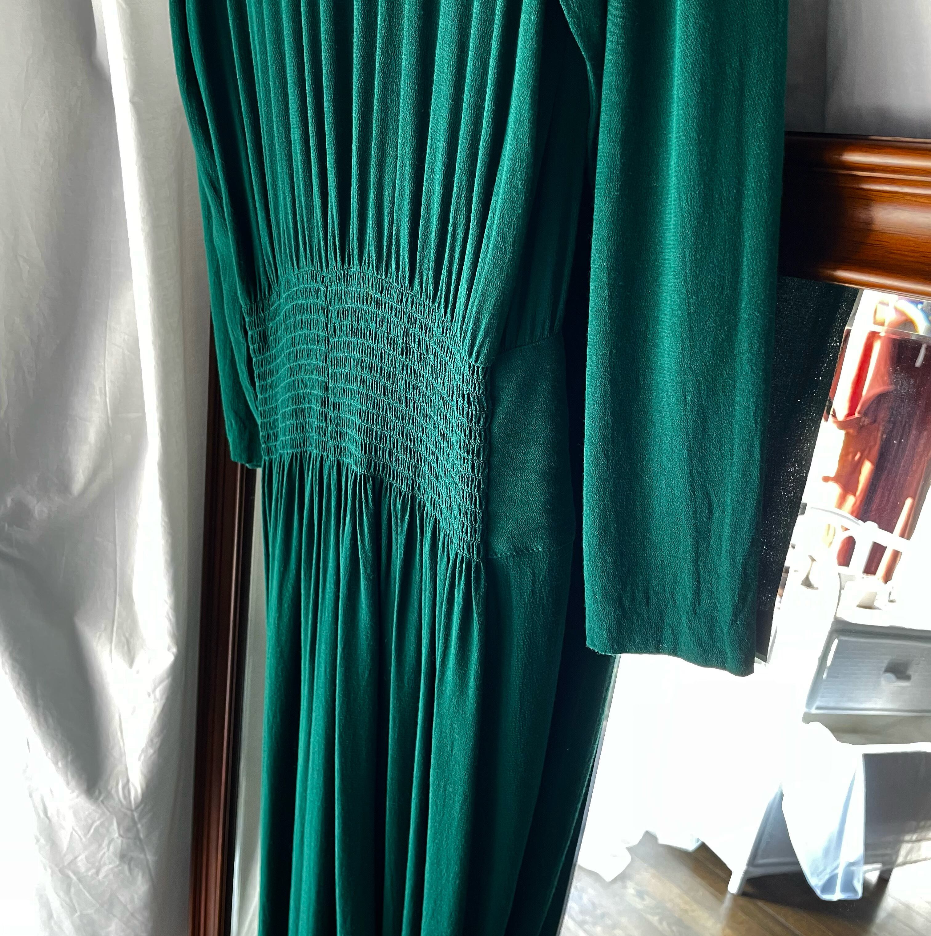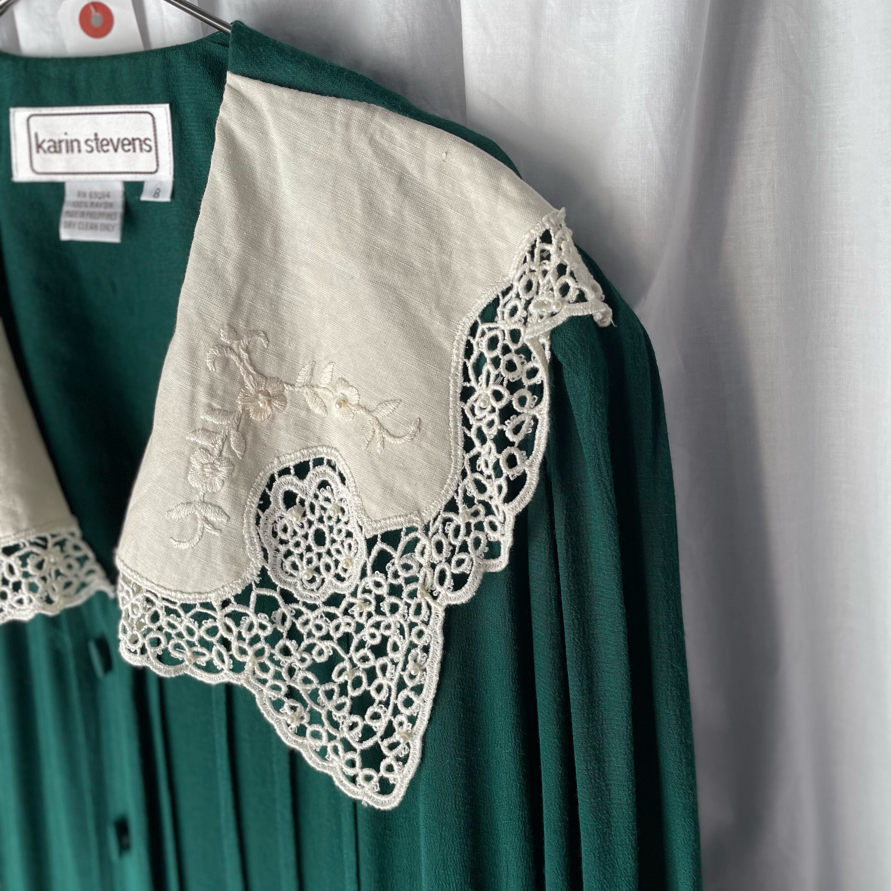 クラシカルな深いグリーンに大きな衿が目を引くワンピース。