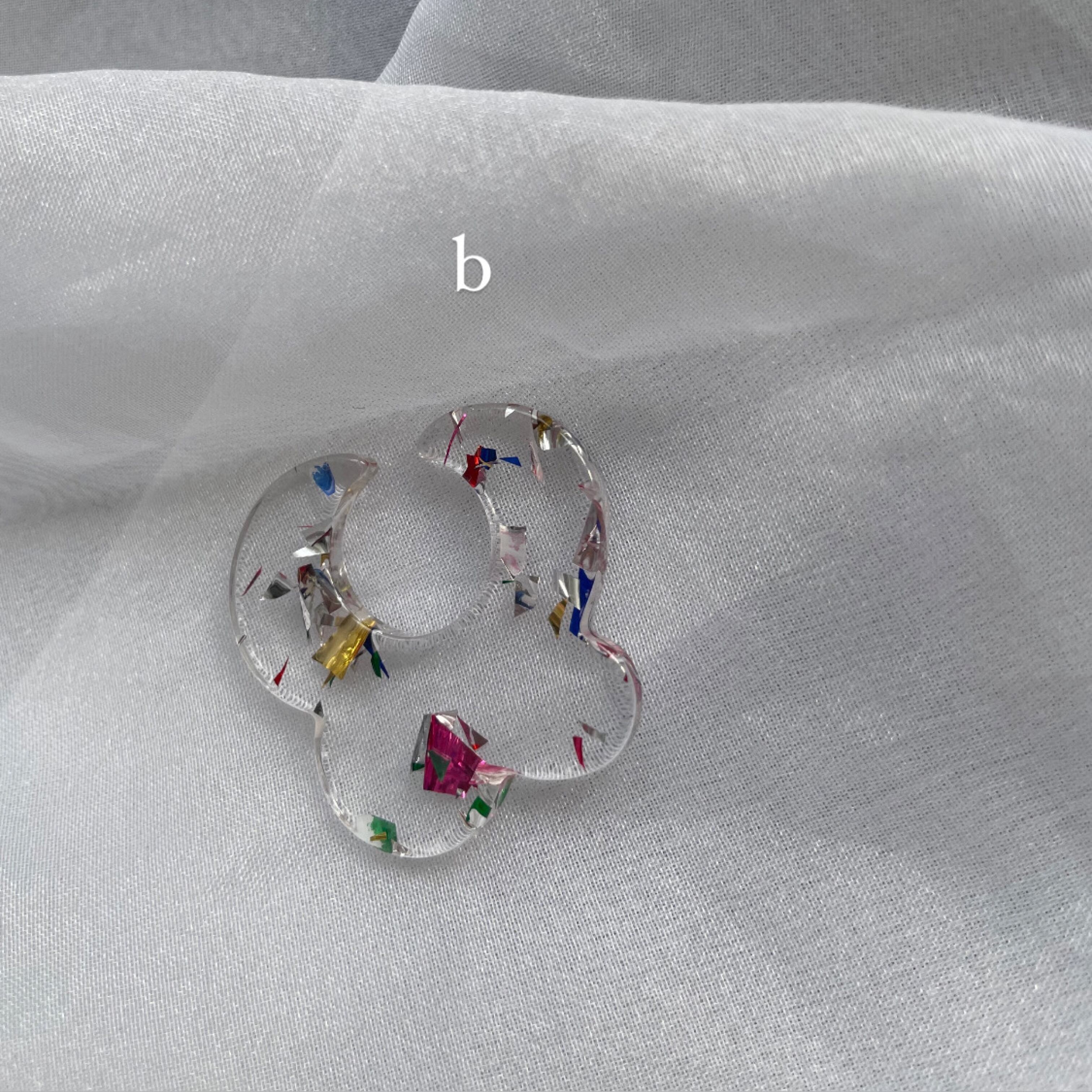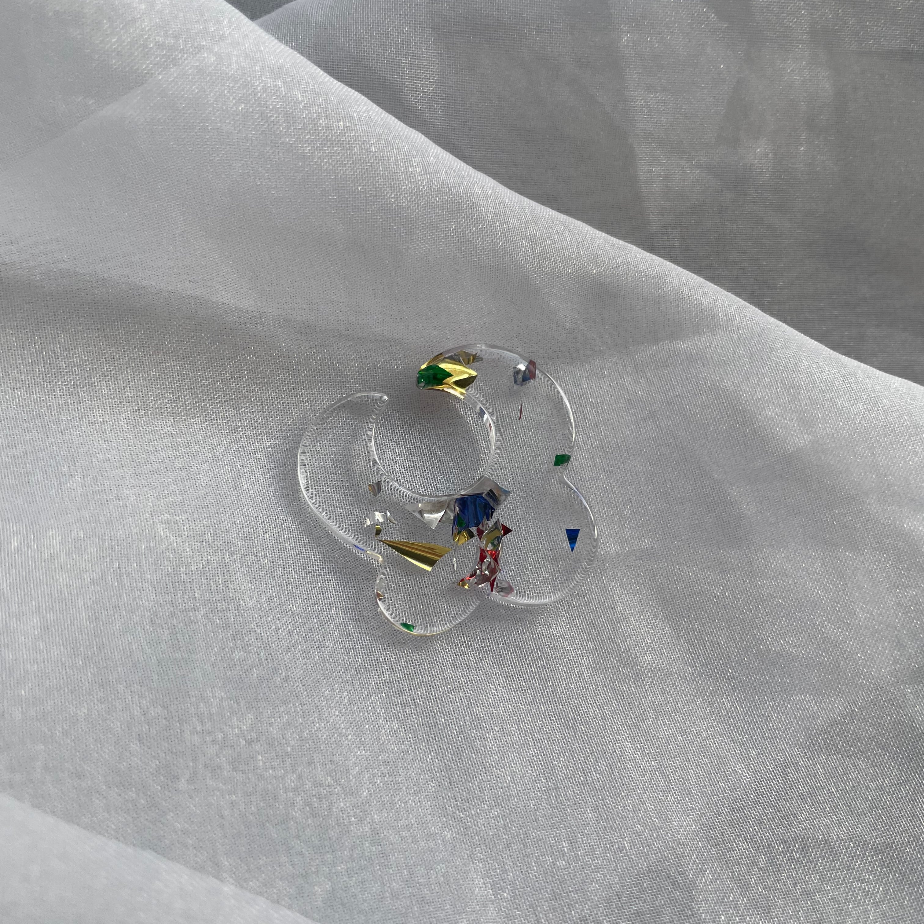 透明なアクリルの中に様々な煌めくカラーが閉じ込められています。