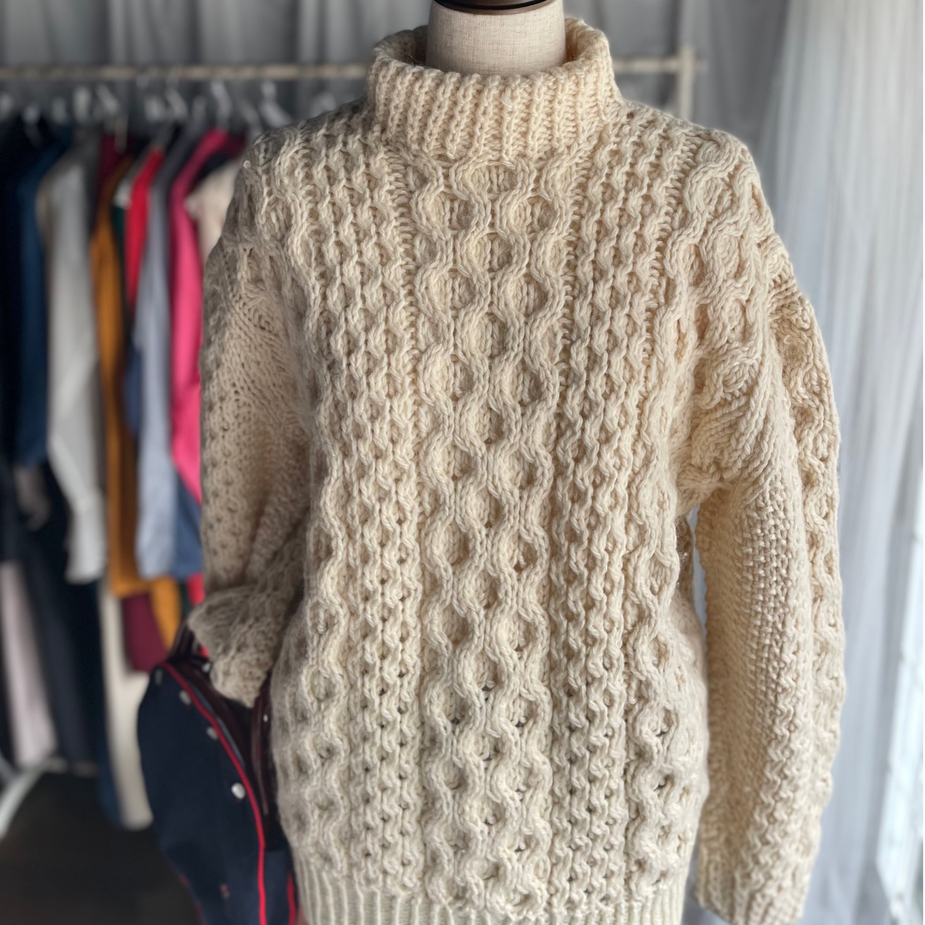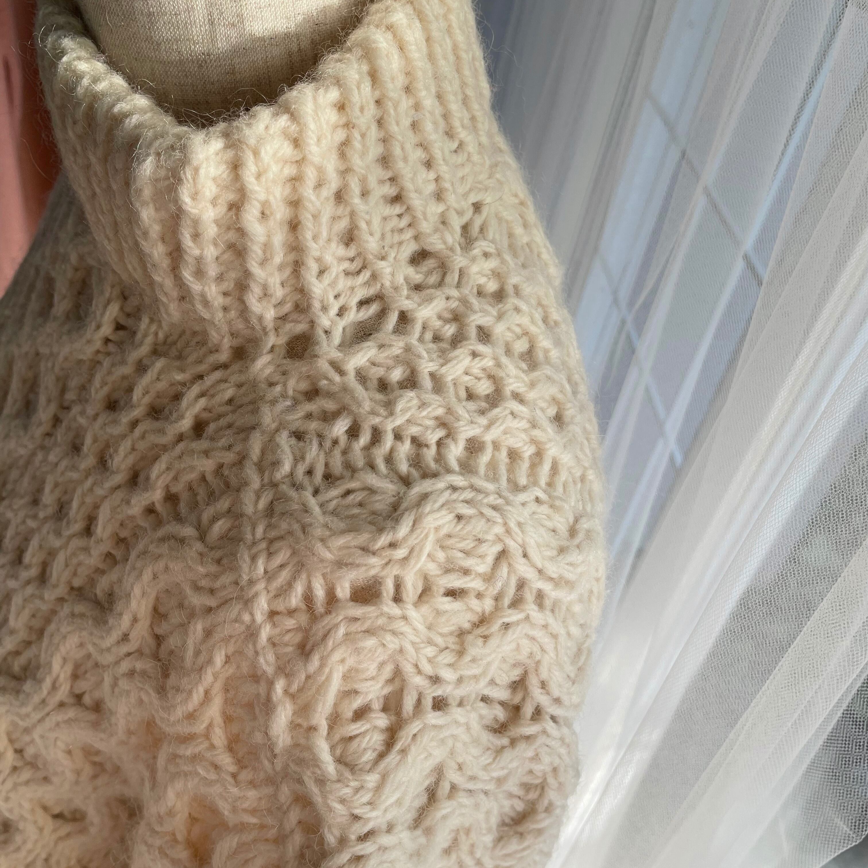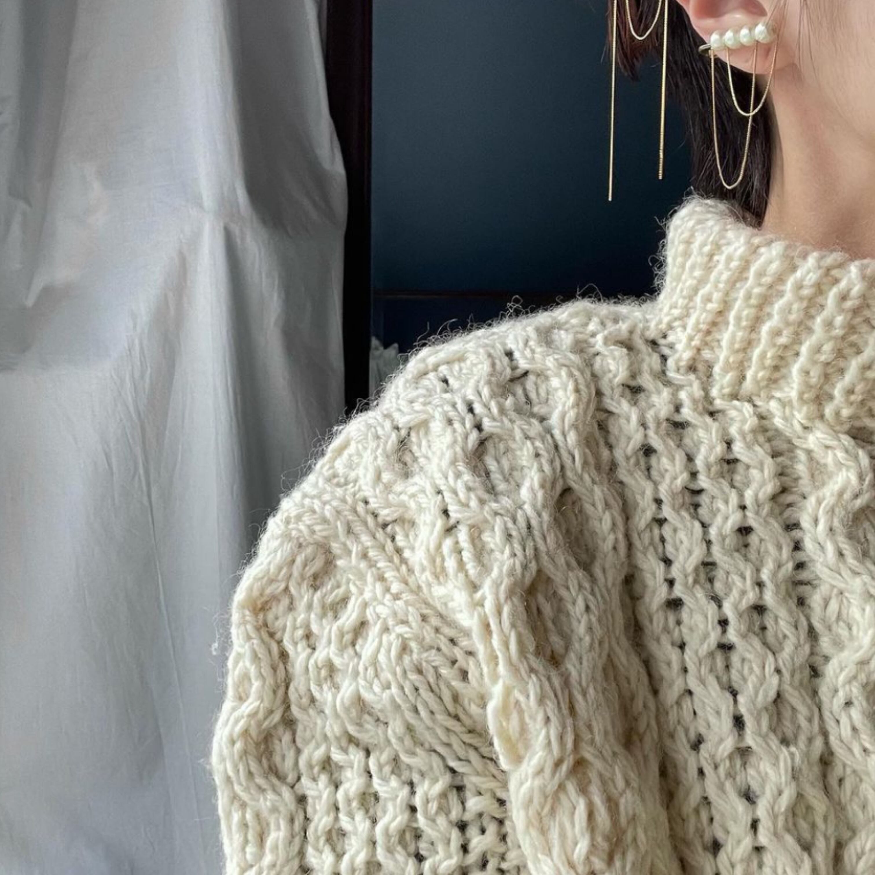 ざっくり編まれた編み柄と高めの襟がかわいい。