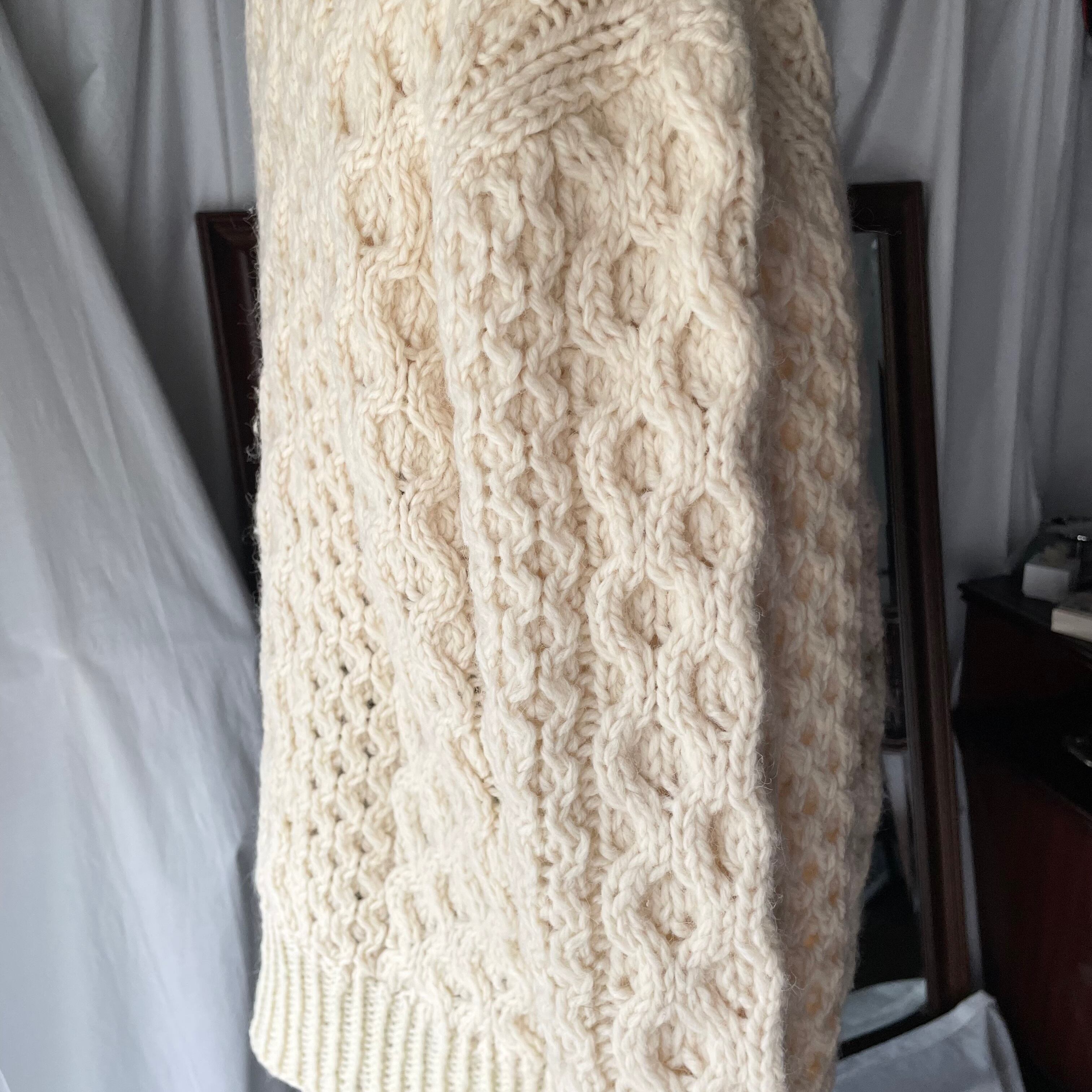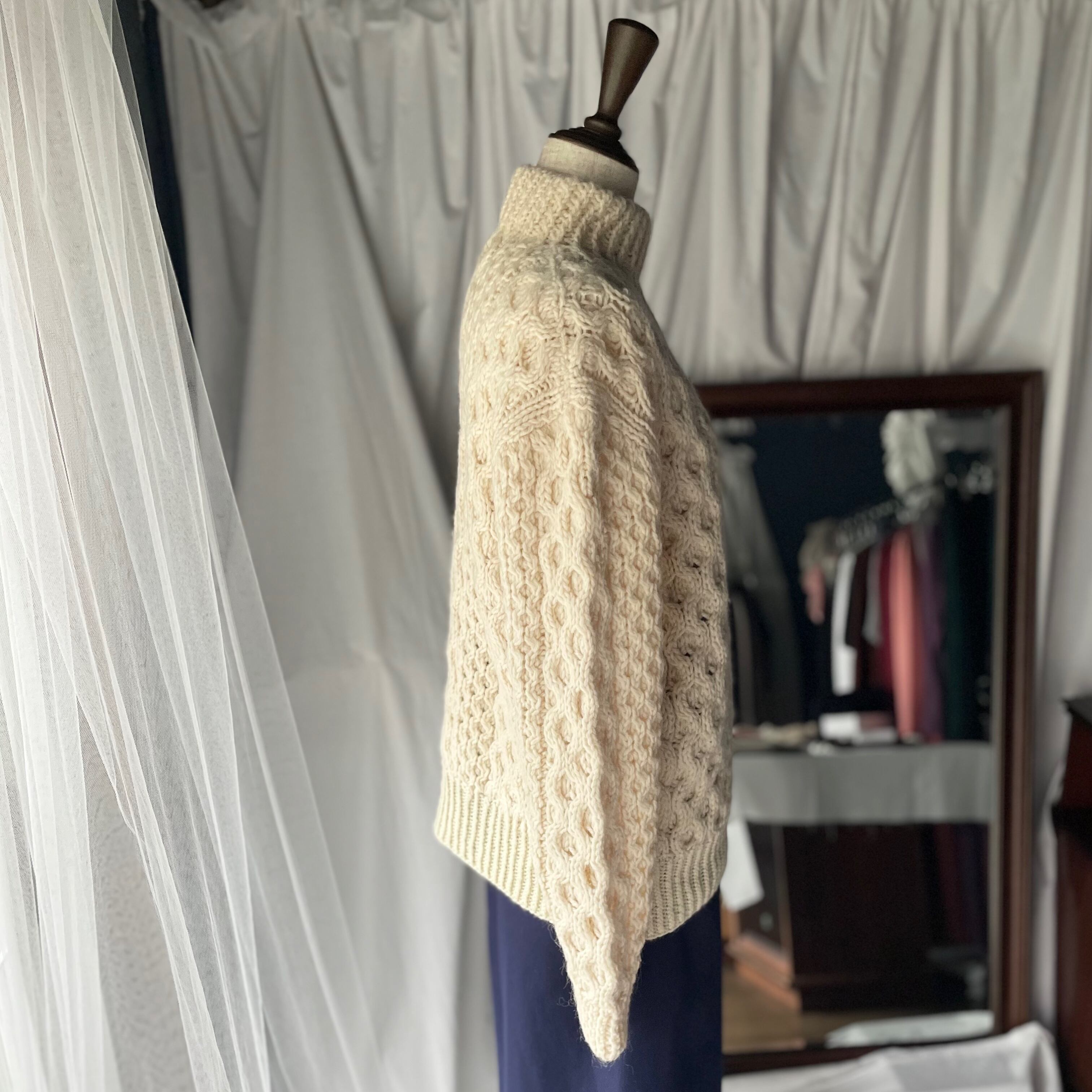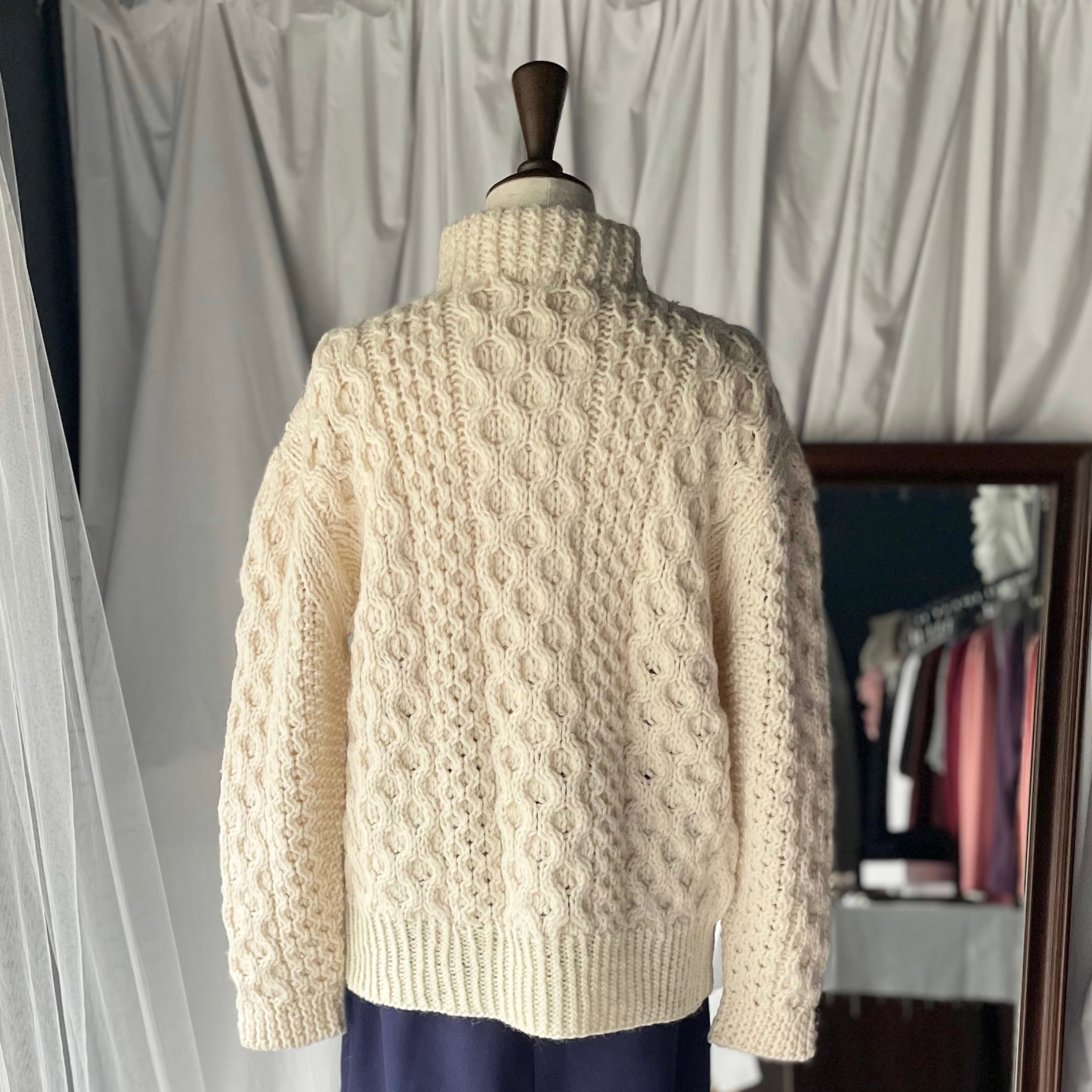 ざっくり編まれた編み柄と高めの襟がかわいい。